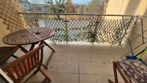 The apartment is 66 sq.m. and consist of a big living room with kitchen and dining area, one bedroom, a balcony and a bathroom with shower, toilet and sink. The apartment is for sale furnished and equipped as it is on the pictures.