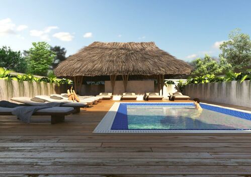 In the rooftop garden : a large deep pool, sundeck area, hammocks and lounge under the palm thatched roof shadow.