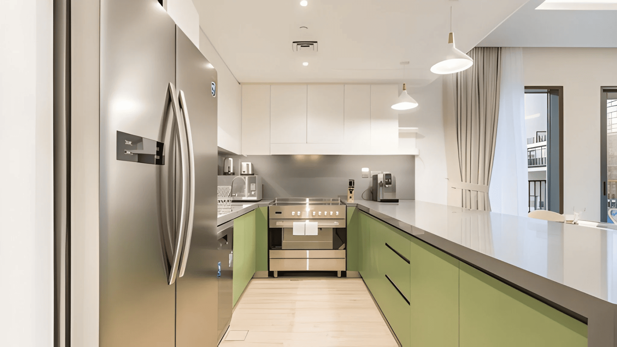 Modern Gourmet Kitchen: An open-concept kitchen equipped with state-of-the-art built-in appliances, sleek cabinetry, and premium countertops.