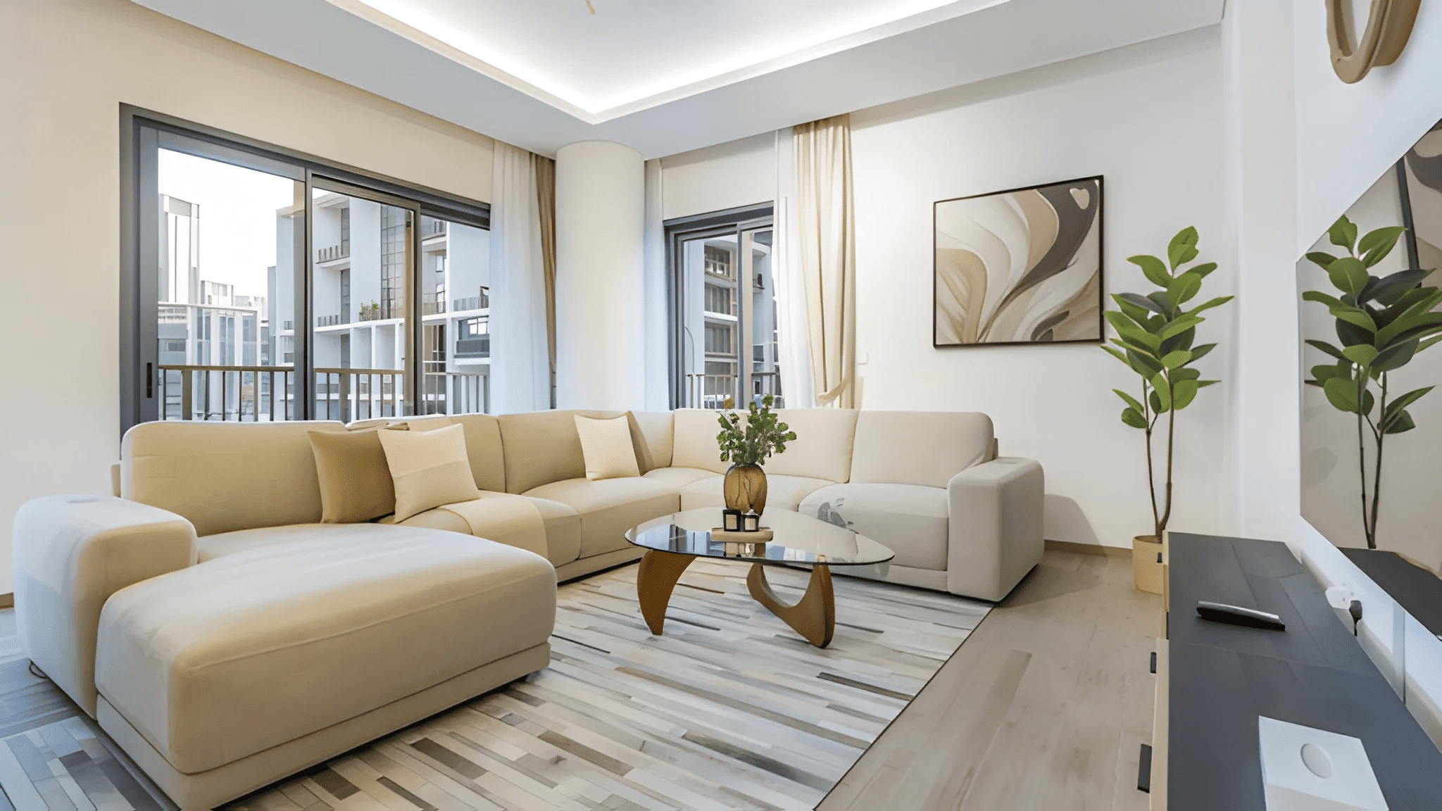 Spacious Living Area: A bright, open-plan living room featuring a smart TV and elegant furnishings, perfect for relaxation and entertainment.