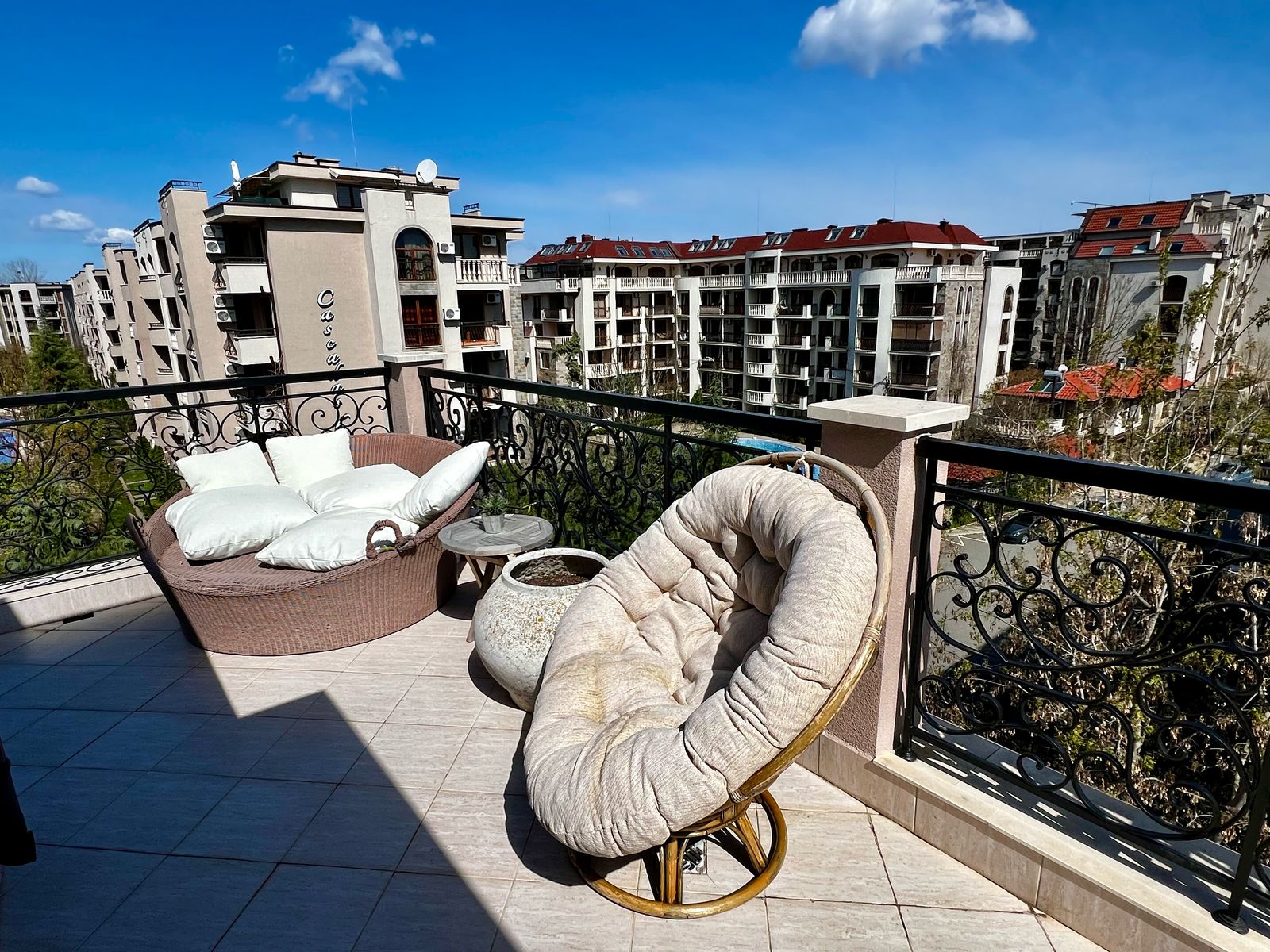 The apartment for sale is in excellent condition, fully furnished and equipped. It is with total area of 91 sq. m. and consists of a living room with kitchen and dining area, two bedrooms, a balcony with pool view and a bathroom with shower cabin, toilet and sink. This nicely furnished apartment is air-conditioned and ready to use or renting out.