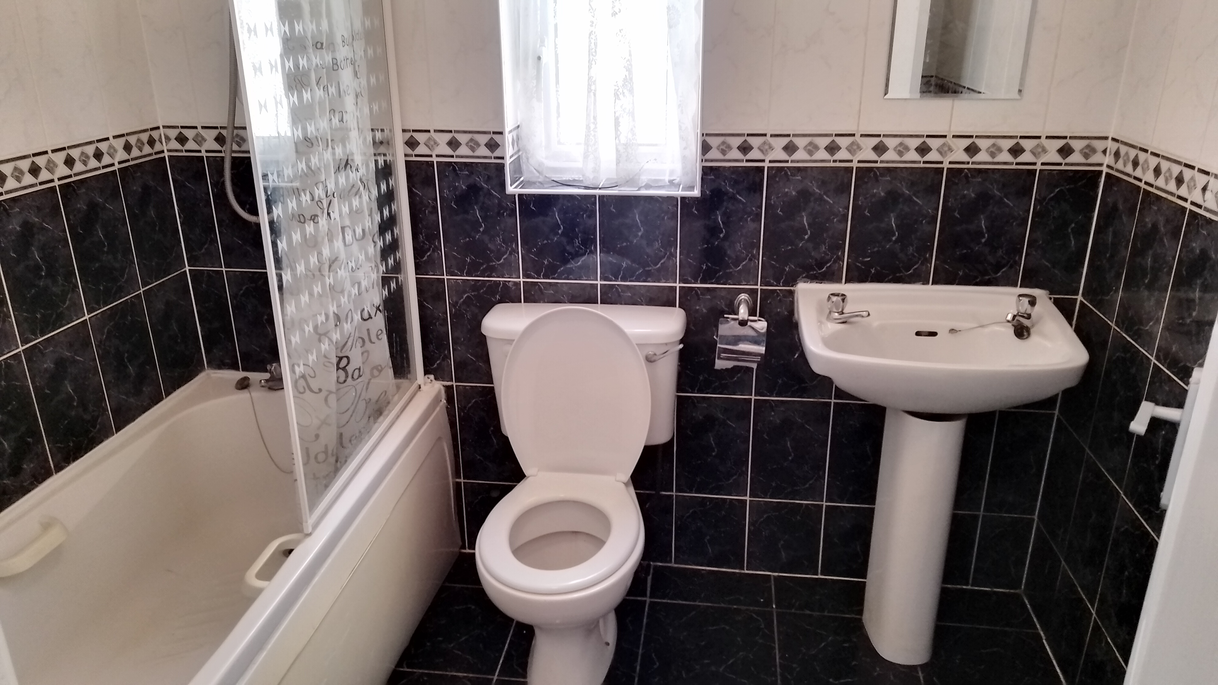 Bath, Pump Triton shower, bath door, WC, WHB, Tiled Floor & Walls, extractor fan.