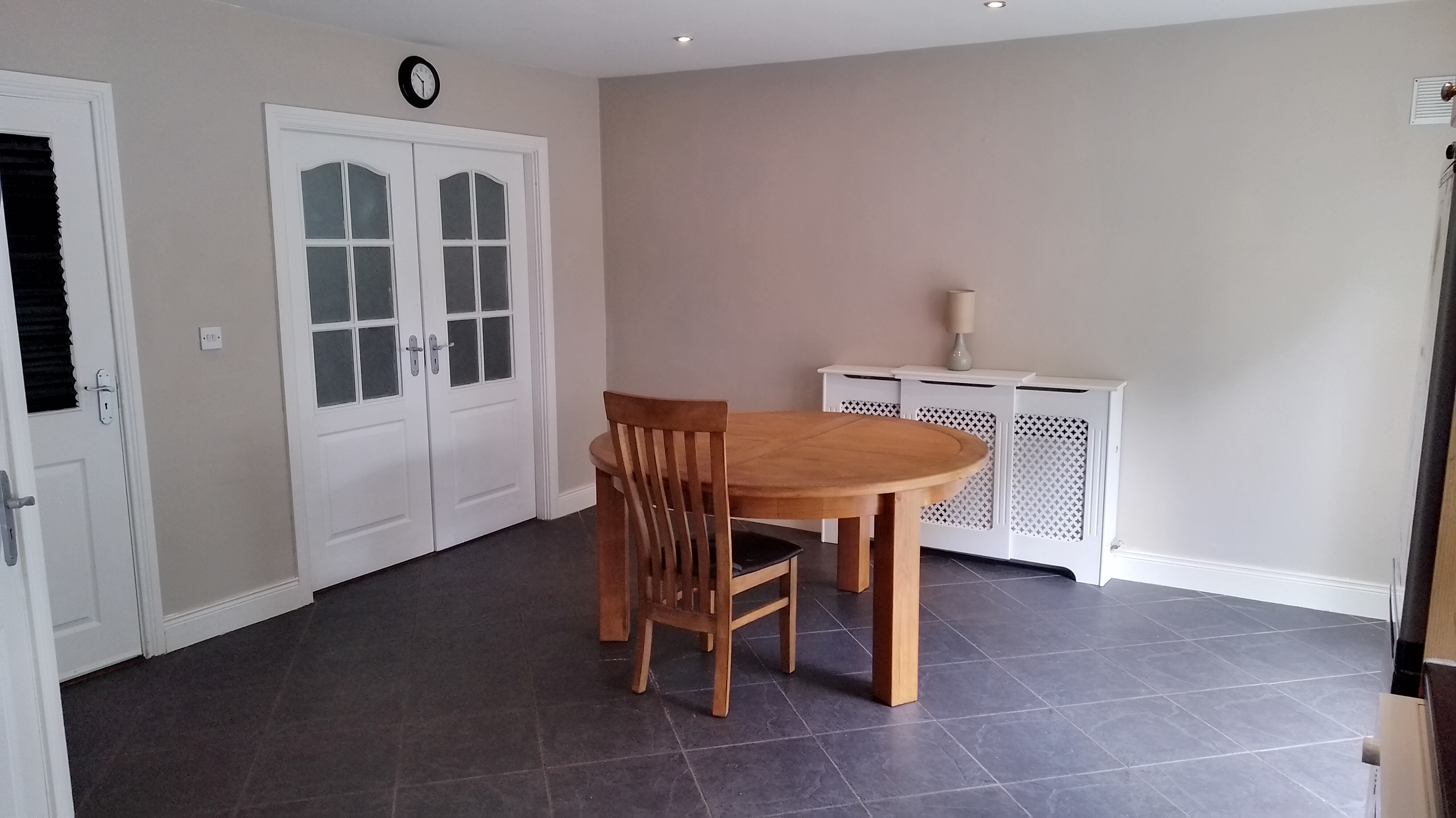 Tiled floor, patio door, radiator cover, blinds.