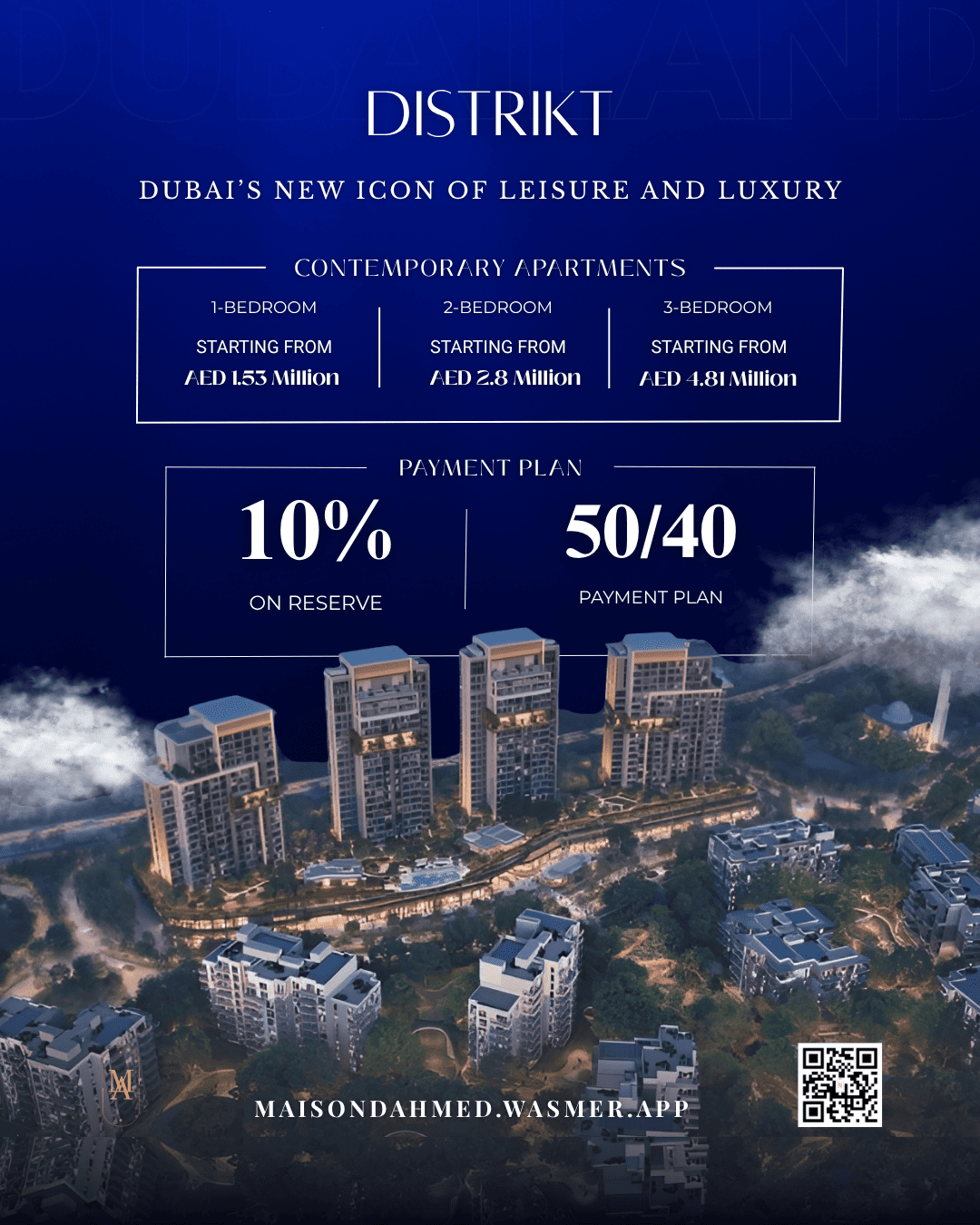 Discover Distrikt, a premium four-tower residential complex in Dubailand, Dubai, offering modern 1–3 bedroom apartments and duplexes with two elegant interior color palettes. Some larger units and duplexes come with private pools.