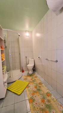 with shower cabin, toilet and sink. There is a storage for the