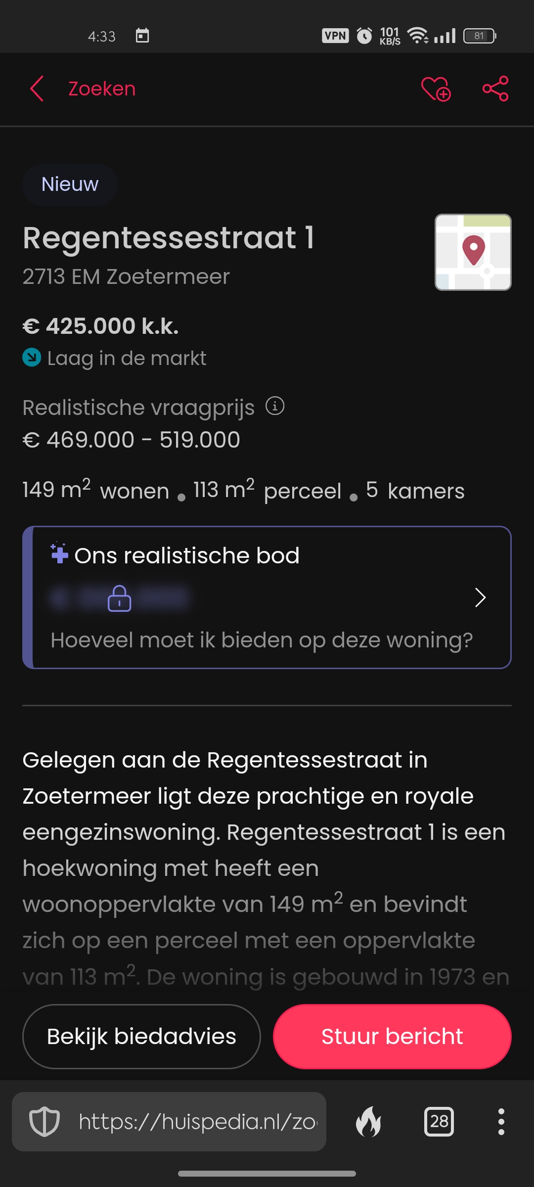 House needs an upgrade in windows. In a beautiful neighborhood, across the street, we have 5 restaurants, store, beauty shop and other shops. It's an amazing, beautiful and upcoming neighborhood, we hate to leave. Brand new buildings going up everywhere in Zoetermeer. It's quite and safe. We are an older couple, fell in ill health, it's only us , and our dog. This is is why we are selling house. All brick of course, built in 1973, has garage and driveway, corner house. Feel free to Google map this bargain house, feel free to contact us. I need to say, it's like living in a Norman Rockwell painting with all the modern technology here.