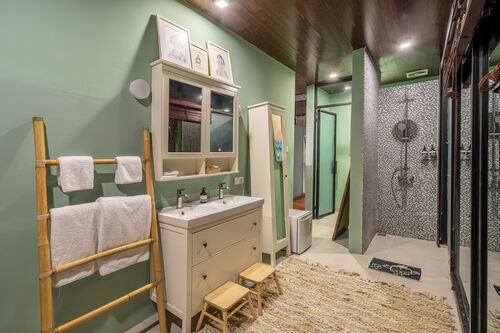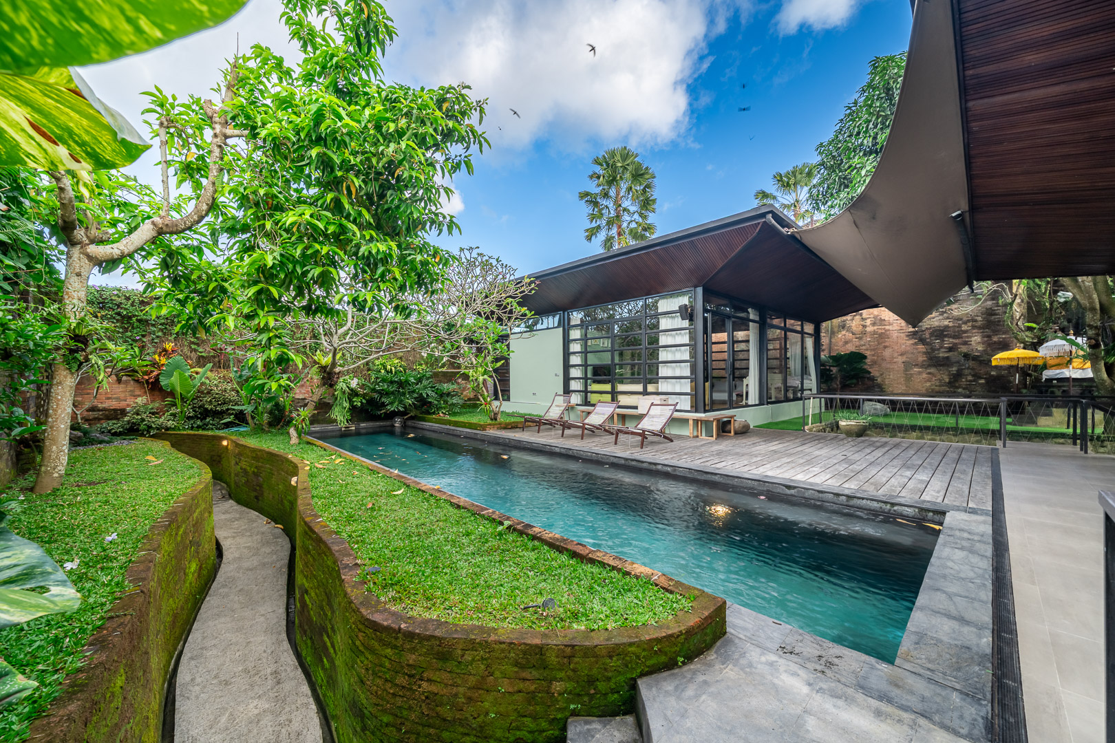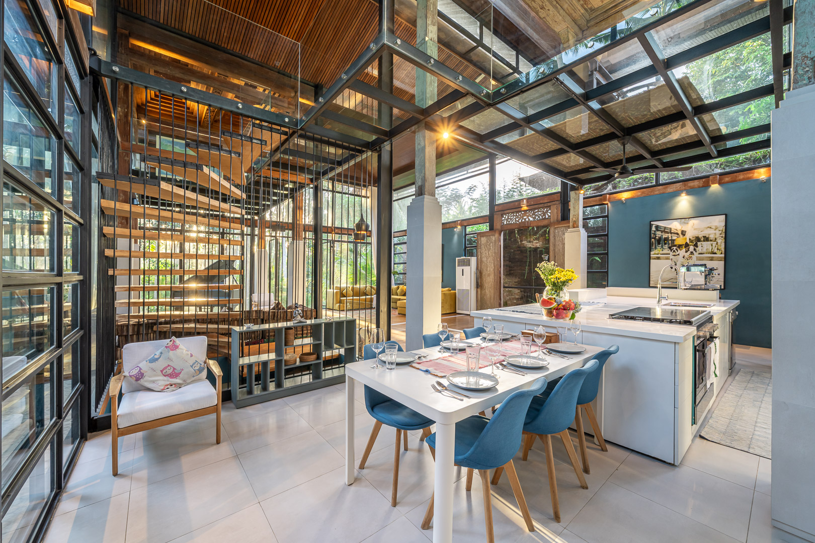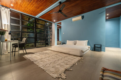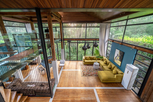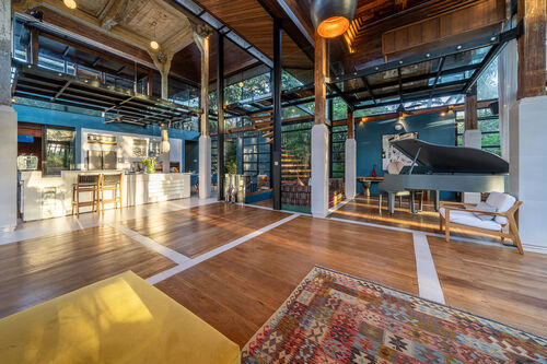Fully renovated in 2021, it offers jungle and river views, a 37.4 sq.m. private pool, glass mezzanine, reclaimed teak wood floors, and curated interiors.