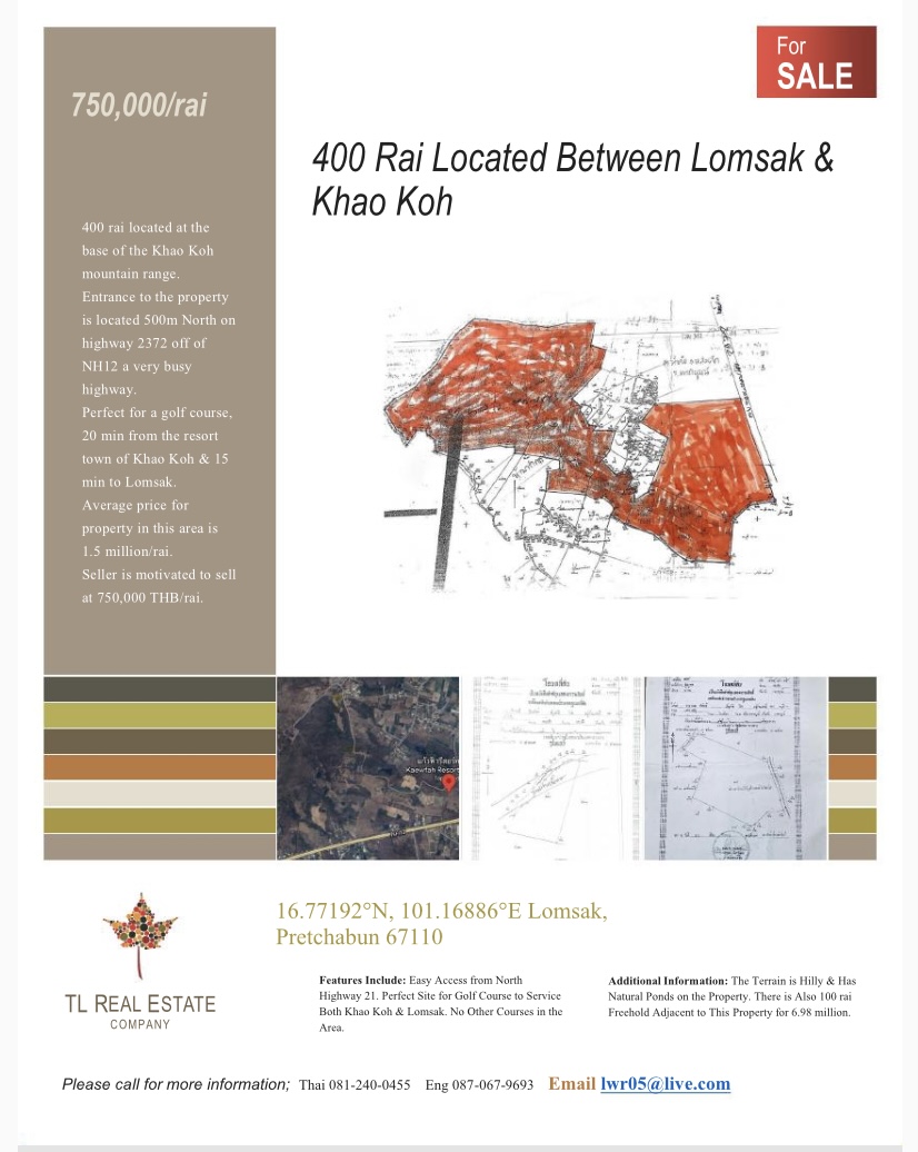 400 rai plus 100 rai freehold on the base of the Khao Koh mountain range. Beautiful views more pics to come soon. Located 20 min from the resort town of Khao Koh and 10 min from Lomsak. Just off very busy highway NH12 makes a perfect site for a golf course.