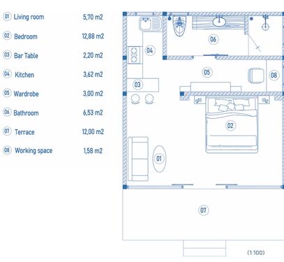 You will have access to the Beach Club, private beaches, sports facilities and coworking space. There are excellent restaurants, bars, a café, shops, health care, wellness and a sports court with a gym.