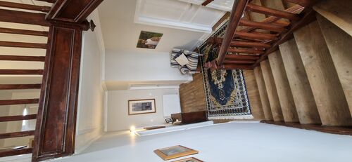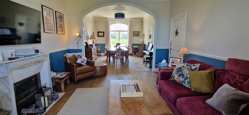 On the ground floor you step into a beautiful hallway with authentic encaustic floor tiles. To the left you'll find a luxury Neptune kitchen, built from Tulipwood with a Falcon induction range oven, built-in full height fridge, built-in Siemens dishwasher, a double bowl Chambord ceramic sink, Perrin & Rowe taps with filtered and boiling hot water along with a Perrin & Rowe pot filler tap over the range. There is seating for 6 people at the large island with lots of storage underneath. Lovely views over the farmland and a sunny room in the mornings. Opposite the door to the kitchen you step into the large open lounge/dining room with large windows at both ends of the room and a beautiful arch separating the two spaces with original parquet floors. The ceilings throughout the ground & first floor are approximately 2.8m with stunning cornice. At the end of the entrance hall are a beautiful set of double doors that open to the staircase, a back door, a door to the cave as well as a utility room/boot room & downstairs Wc. The utility room/boot room is 10 sqm with a sink and plenty of room for additonal storage. The cave is approximately 47 sqm, it houses the Hertz heating system along with a large water tank and offers potential for more storage, in a cool space all year round.