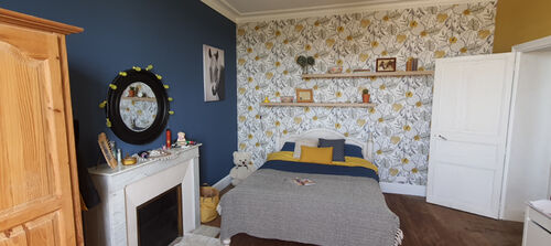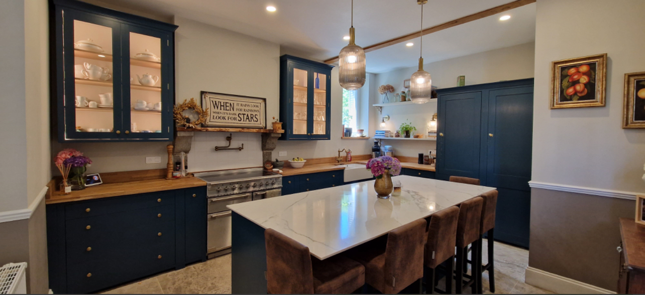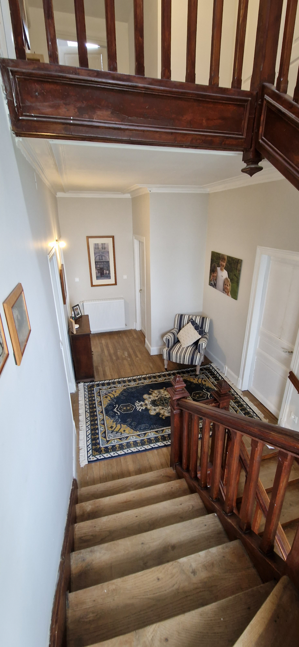 On the ground floor you step into a beautiful hallway with authentic encaustic floor tiles. To the left you'll find a luxury Neptune kitchen, built from Tulipwood with a Falcon induction range oven, built-in full height fridge, built-in Siemens dishwasher, a double bowl Chambord ceramic sink, Perrin & Rowe taps with filtered and boiling hot water along with a Perrin & Rowe pot filler tap over the range. There is seating for 6 people at the large island with lots of storage underneath. Lovely views over the farmland and a sunny room in the mornings. Opposite the door to the kitchen you step into the large open lounge/dining room with large windows at both ends of the room and a beautiful arch separating the two spaces with original parquet floors. The ceilings throughout the ground & first floor are approximately 2.8m with stunning cornice. At the end of the entrance hall are a beautiful set of double doors that open to the staircase, a back door, a door to the cave as well as a utility room/boot room & downstairs Wc. The utility room/boot room is 10 sqm with a sink and plenty of room for additonal storage. The cave is approximately 47 sqm, it houses the Hertz heating system along with a large water tank and offers potential for more storage, in a cool space all year round.
