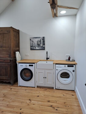 Taking the stunning staircase up again to the 2nd floor, you'll find two further bedrooms (18,5 sqm & 20 sqm), a bathroom with shower, water heater, vanity & Wc as well as a stunning laundry room (19 sqm) with beautiful views, gorgeous oak beams, a sink & space for washing machine & tumble dryer as well as a pull-down ladder serving the loft space (18 sqm). The laundry room is easily big enough to become another bedroom or living space. There is also a storage room on this floor (3.5 sqm).