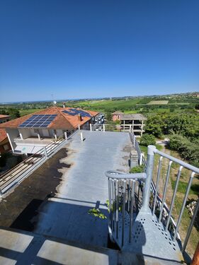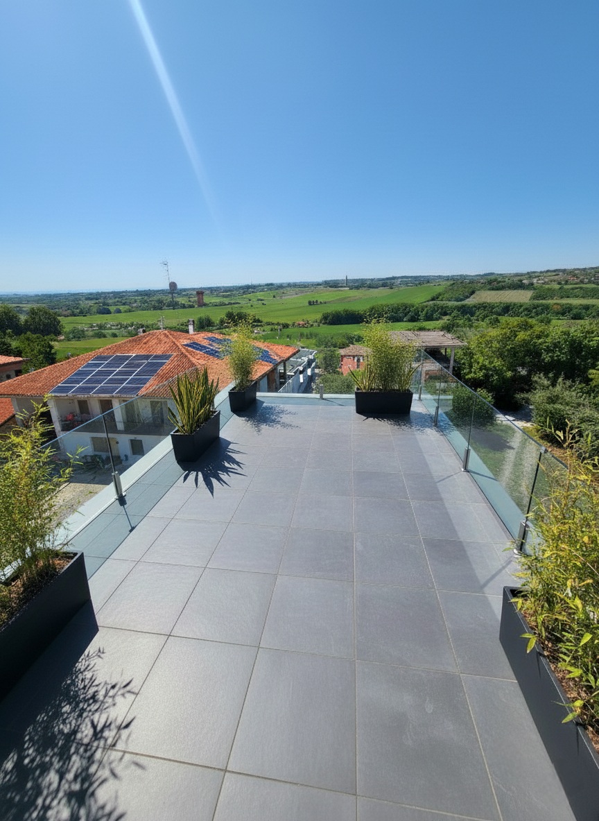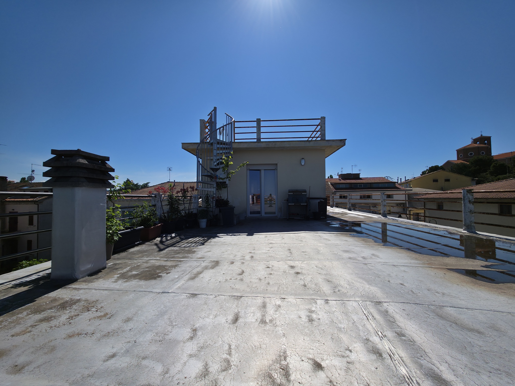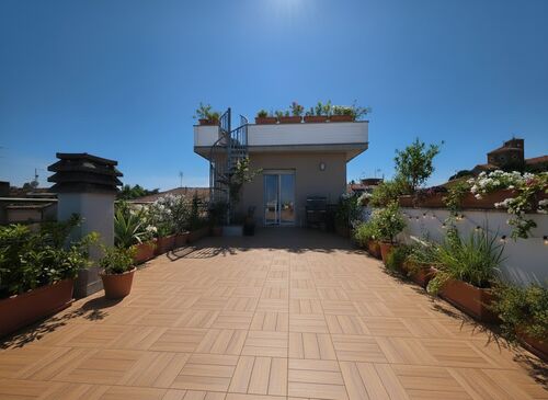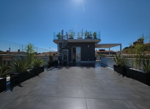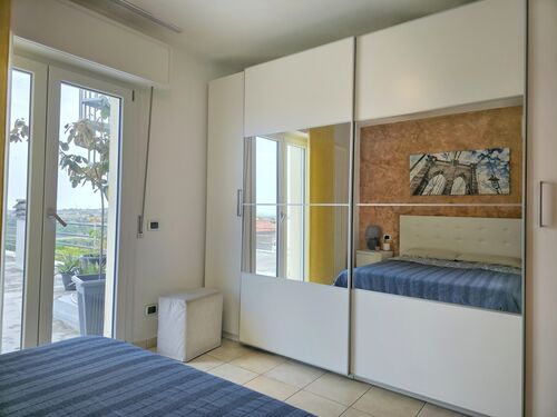 The true heart of this residence is its outdoor space. The master bedroom opens onto a first magnificent terrace of 130 sqm. A charming spiral staircase then leads up to the second rooftop terrace of 40 sqm—a privileged vantage point with a 360-degree view that sweeps from the Romagna coastline over the Sangiovese hills, all the way to Mount Titano in the Republic of San Marino.