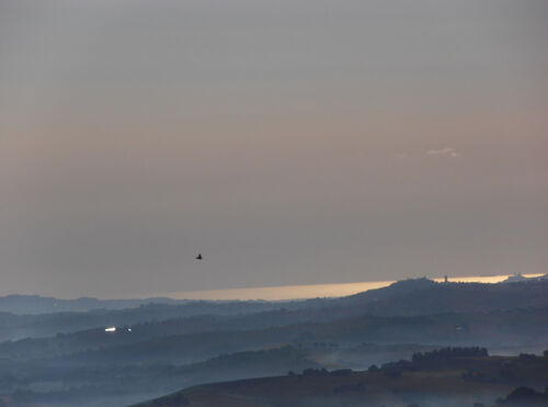 Facing east south east, golden fingers of early sunlight glint softly on the golden stone farmhouse and olive groves.
