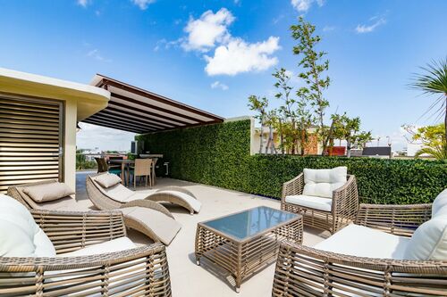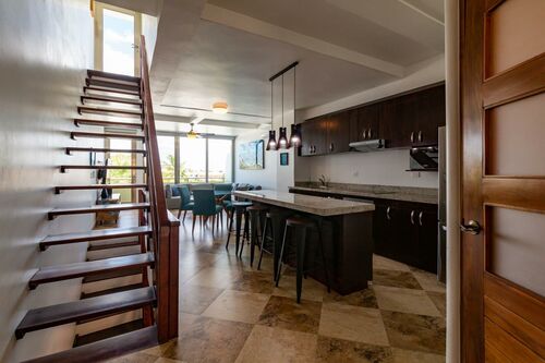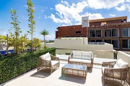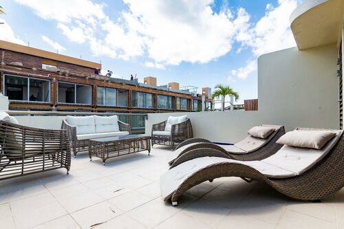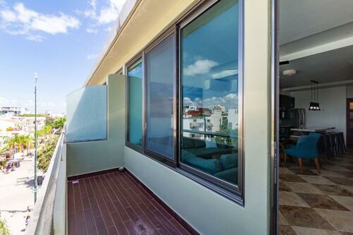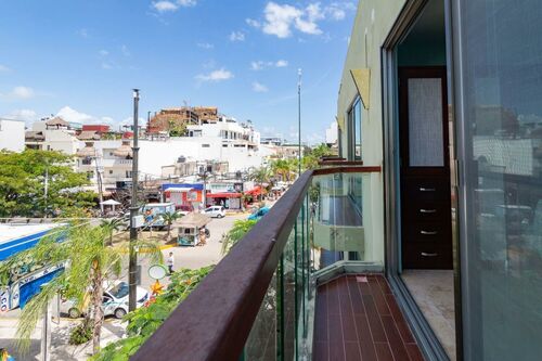 3 Story PH with partial view to the sea from the rooftop. On 5th Avenue at corner of 38th Calle, Playa del Carmen In the Mimosa Residences (above La Brioche bakery) 3 bedrooms 3 full bathrooms Private rooftop 205 square meters Fully furnished / turnkey includes: *All new, modern furniture *All kitchen appliances, pots/pans, dishes, etc. *New stackable washer & dryer *Bottled water system that connects to refrigerator to provide unlimited ice & cold drinking water *Air conditioning & ceiling fans in all rooms *Beach chairs, beach towels & snorkeling equipment *Bath towels, sheets, blankets, etc. *Digital keypad for door *2 Safes installed 1st Master bedroom has king bed, 2nd master bedroom has two twins that are pushed together seamlessly to make a king (can be separated if needed) and 3rd bedroom has a bunk bed which has full size bed on bottom and twin on top. 3 full bathrooms (both masters have double sinks) and all with tiled walk-in showers. Air conditioning in all bedrooms and living room as well as ceiling fans throughout condo. 2 private balconies overlooking 5th Avenue as well as huge private rooftop with table, chairs, loungers and a peekaboo view of the gorgeous ocean. Entire condo has been completely renovated (kitchen, cabinetry, lights, appliances, paint, etc.) and all furniture is brand new. Building Amenities: *Pool with deep end, shallow end, waterfall feature, heated jacuzzi w/bubbles *Bilingual (English & Spanish) concierge desk to help arrange tours, airport transfers, taxis, etc. *Building has 24/7 security with locked front security door, pool, elevator and stairs *Underground parking available for rent "