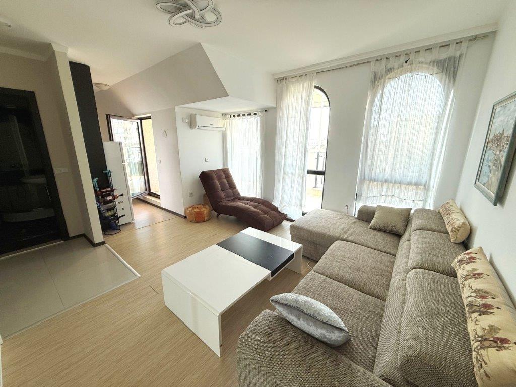 IBG Real Estates is pleased to present this spacious 1-bedroom apartment (2 rooms) with a large terrace offering beautiful sea and mountain views. The property is located on the 4th floor (out of 5) in South Bay, Sveti Vlas – a modern complex with excellent location, just a short walk from the beach and all city amenities.