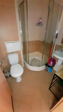 Bathroom with shower cabin, toilet and sink
