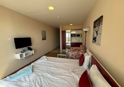We offer for sale a stylish and functional studio apartment, located in the prestigious Premier Fort complex in Sveti Vlas, directly on the beachfront.