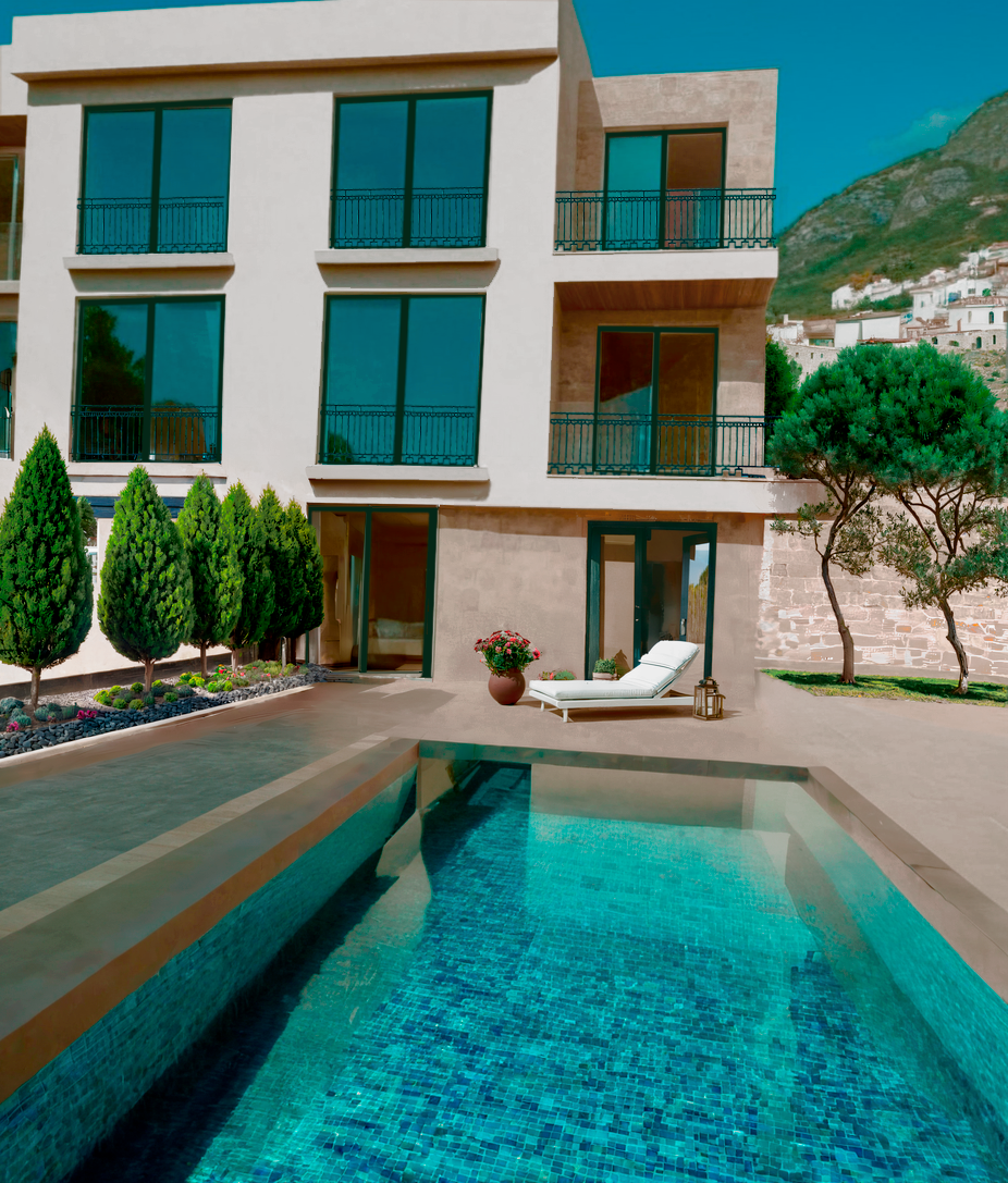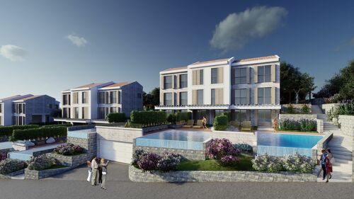 An exclusive enclave of 9 luxury townhouses spread across three buildings (A, B, C) on the Budva Riviera. Each unit (225–230 m²) features a private pool, two-car garage and high-end specification. Superb location: