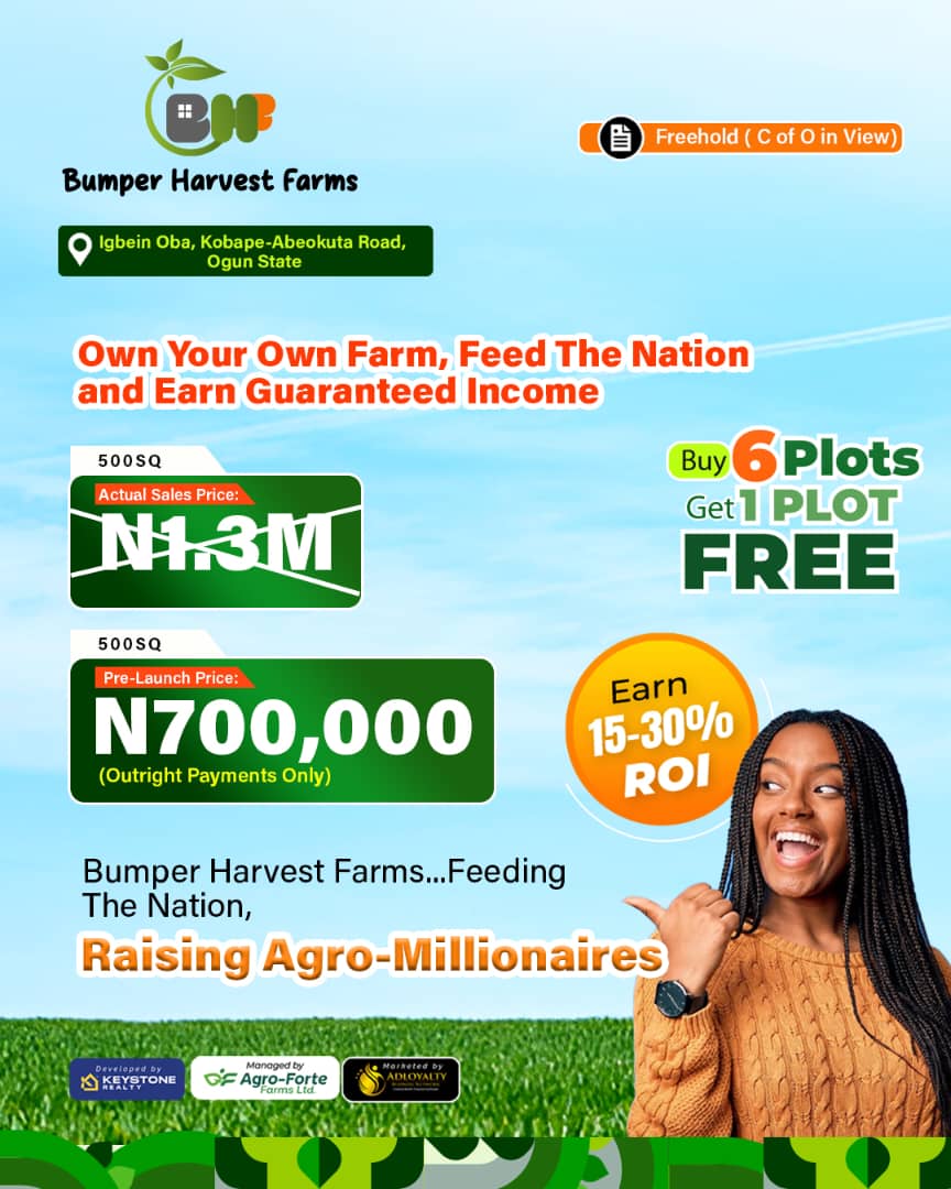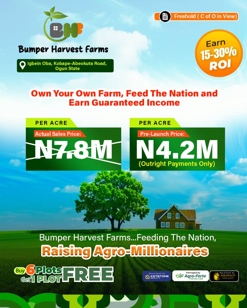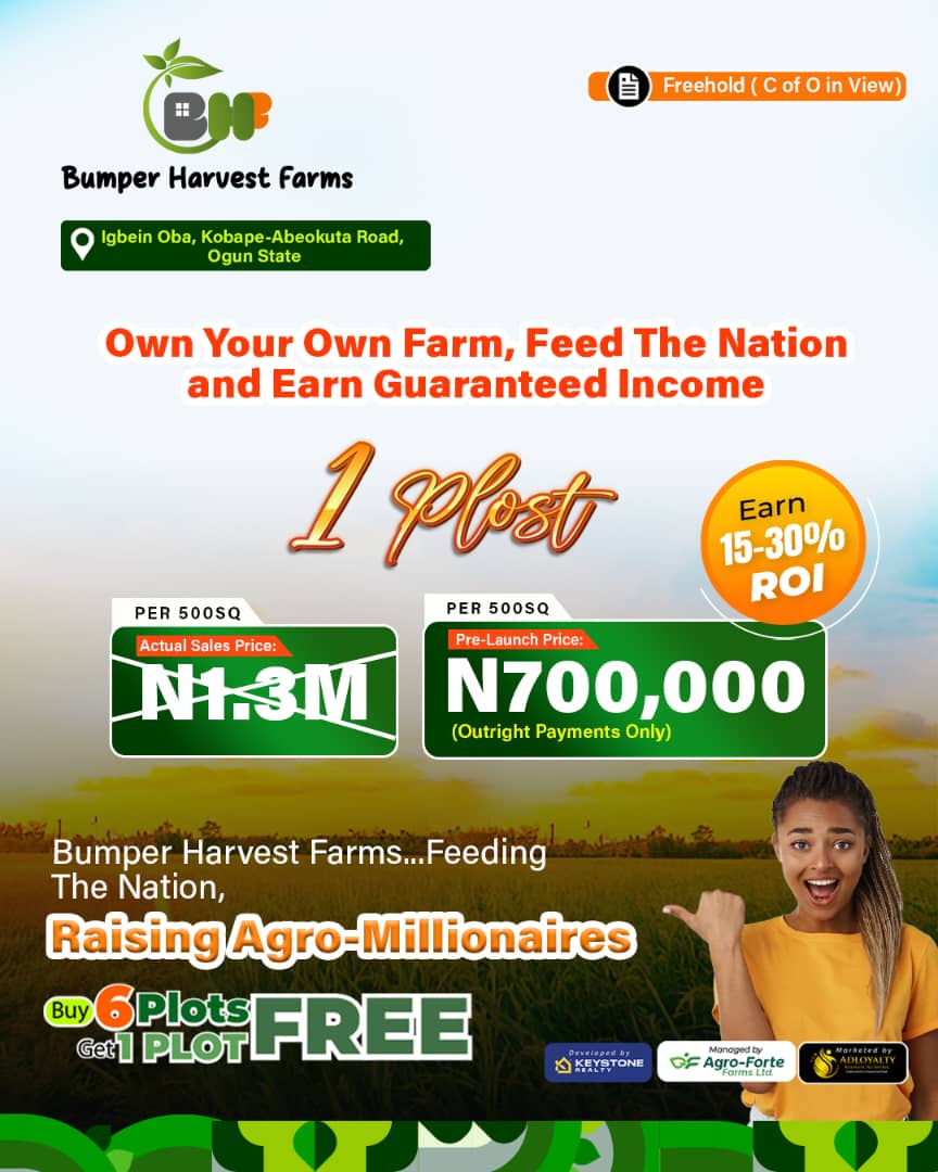 Bumper Harvest Farms gives eagle-eyed investors the unique opportunity to create wealth through agriculture by producing food either for home consumption or for commercial agricultural purposes thereby increasing the needed supply necessary to curb food prices inflation.