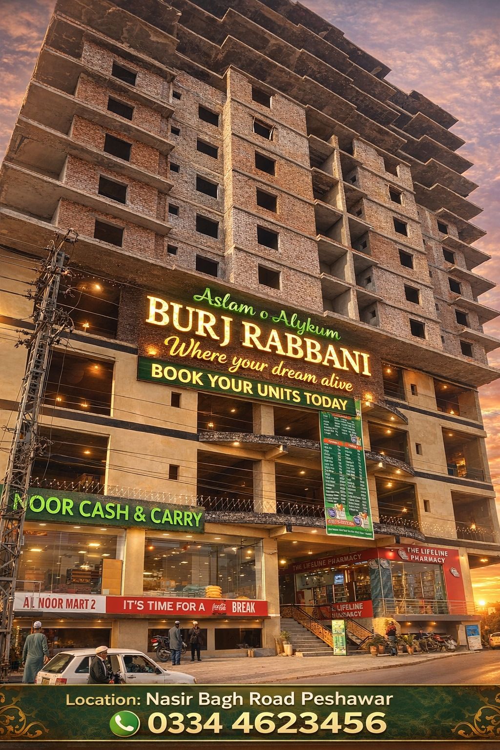 Step into a world of modern living and smart investment at Burj Rabbani, a landmark mixed-use development located on Main Nasir Bagh Road, directly opposite Askari-6, and just minutes from DHA and Regi Town, Peshawar.