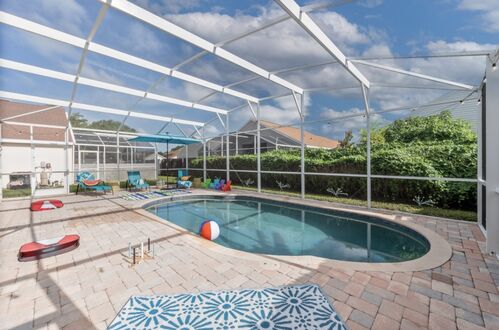 Located on a quiet residential street in the Chatham Park community of Kissimmee, the home features a bright, open floor plan with vaulted ceilings and abundant natural light. The combined living and dining area offers a full wall of sliding glass doors overlooking the screened patio and private heated pool, creating seamless indoor-outdoor living. The living room sofa converts to a queen bed, and the dining table comfortably seats up to twelve.