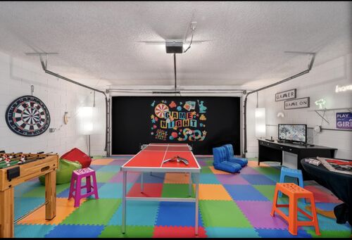 The first floor primary suite includes a king bed, en-suite bath with double-sink vanity, and a spacious walk-in closet. A second full bathroom is also located on the main level. The garage has been professionally converted into a game room but can be easily reverted to a two-car garage if desired.