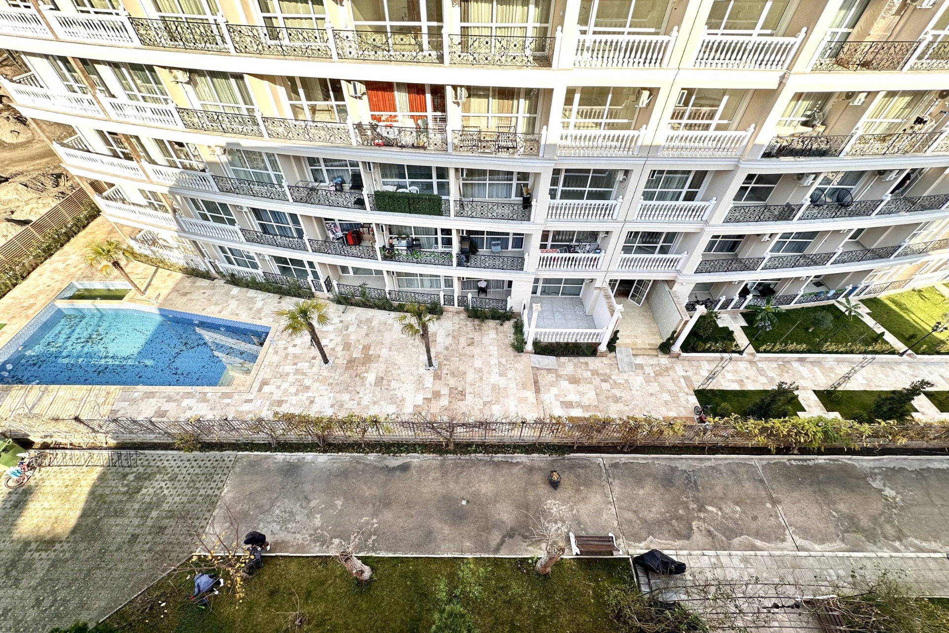 The studio overlooks the inner yard of the complex, providing a quieter atmosphere away from the main street. The apartment is sold unfurnished, which gives the new owner full flexibility to design and furnish the space according to personal taste or rental strategy.