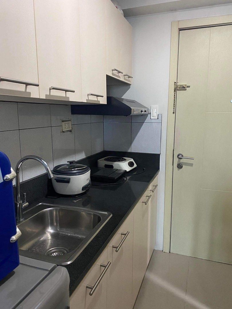 Studio Unit. Floor Area: 23 sqm. Fully Furnished with a sofa, cabinets, single bed, tables, refrigerator and other kitchen necessities