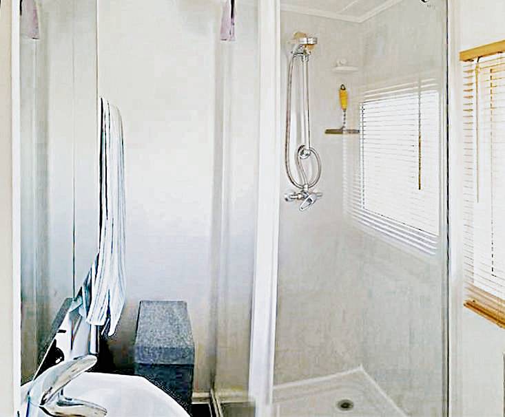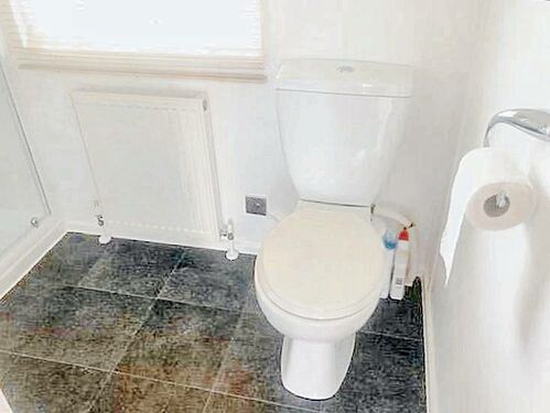 A well-appointed shower room includes a large shower cubicle, hand basin, and toilet.