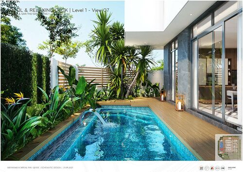 Inside: Hawaiian style tropical garden - American style, Artificial sea salt swimming pool in each villa, American style BBQ roof garden Aloha sunbathing area