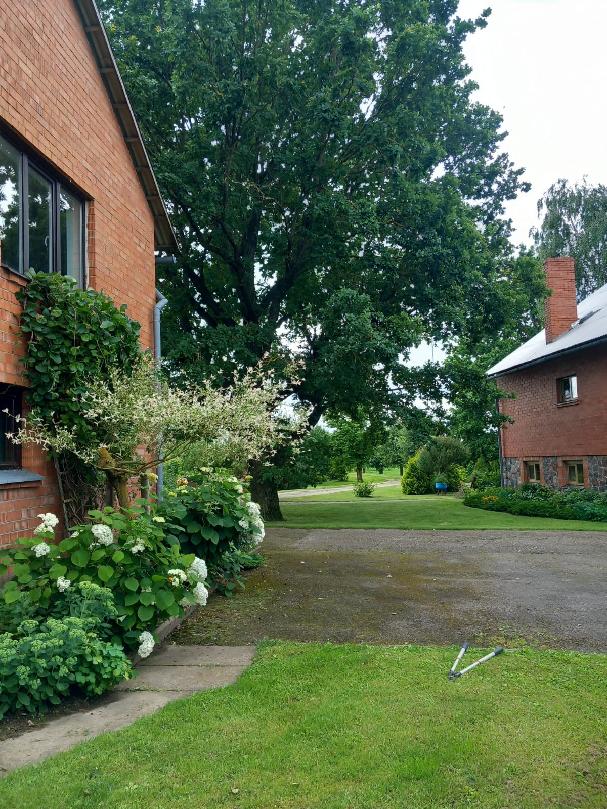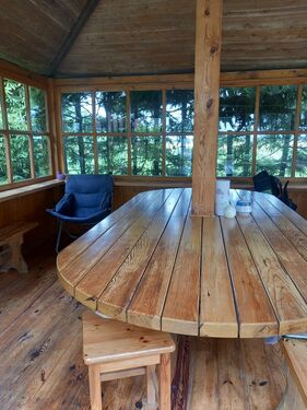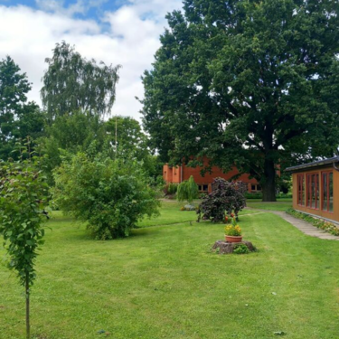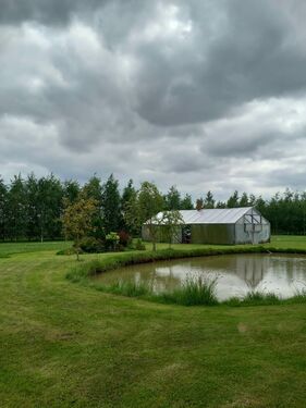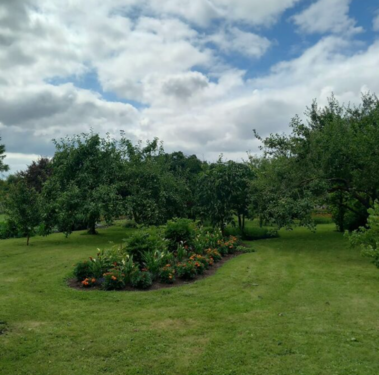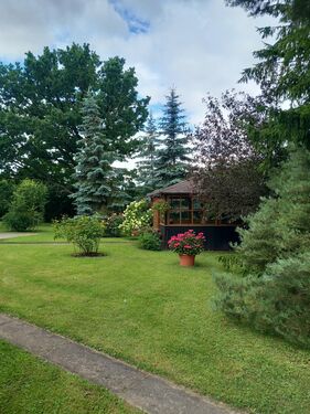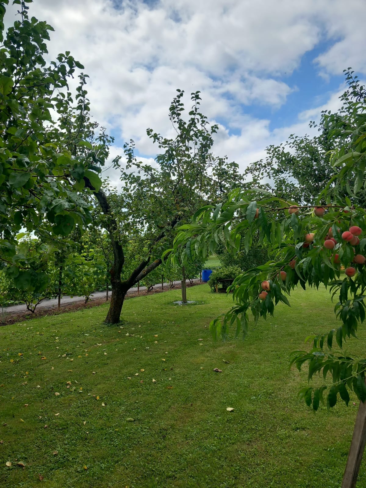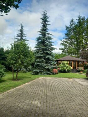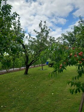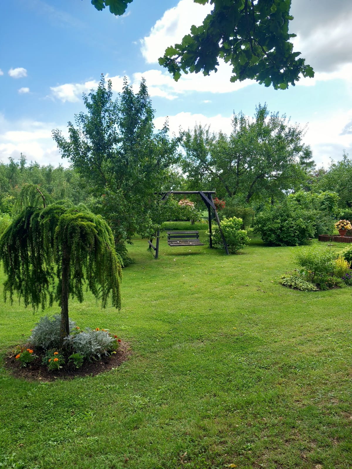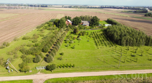 Large apple orchard, other fruit trees and shrubs. The territory is fenced. Pine, spruce and birch forest plantations in the territory.