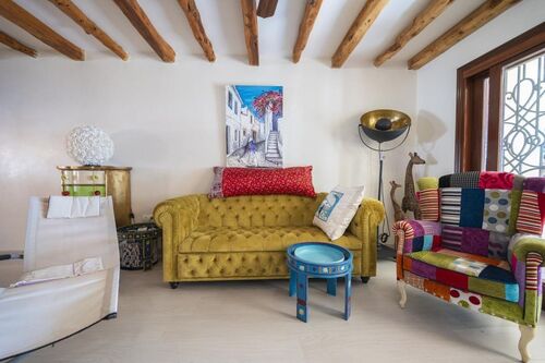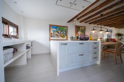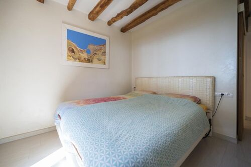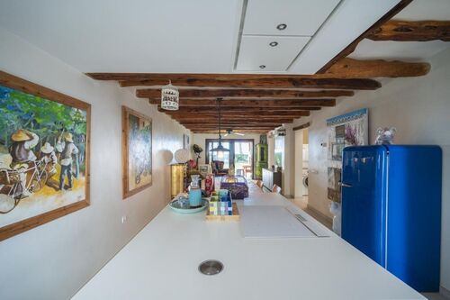 The apartment features a spacious living room with an open-plan kitchen and central island, perfect for everyday living and entertaining. Charming architectural details such as exposed wooden beams add warmth and character to the interior.