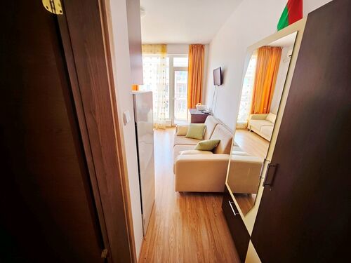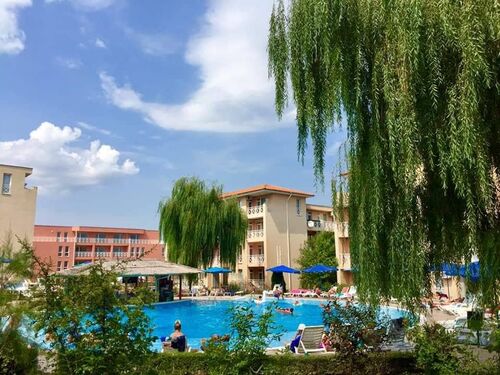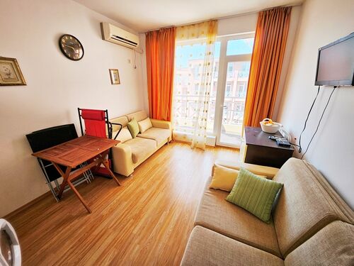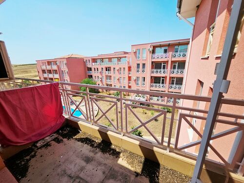We offer for sale a furnished apartment in a holiday complex, located 3 km. from Sunny Beach, in the direction of the village of Tankovo. On the territory of the complex there are five swimming pools, several sports grounds, a supermarket, a restaurant, playgrounds, mini golf courses. The complex is perfectly landscaped and offers many places to relax. It is suitable for permanent living. The service company provides round-the-clock security and takes care of the safety of the owners and tourists. The apartment we offer is located on the fourth floor of a building without an elevator. It consists of a living room with a kitchenette, a bathroom with a toilet and a terrace with a nice view of the yard and the pool. The apartments in the area are a great investment for renting out. They are extremely sought after by people working in the complex. The annual maintenance fee is 580 Euro. The complex has Act 16.