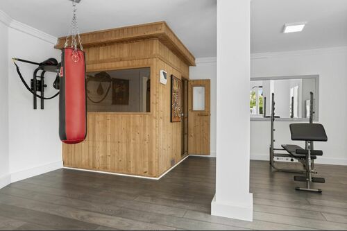 The lower ground floor adds further value with a guest bedroom and bathroom, as well as a fully equipped gym, sauna, and shower facilities.