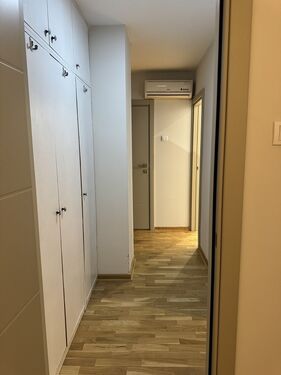 The apartment has built-in wardrobes up to the ceiling, with deep and wide shelves and hanging parts: