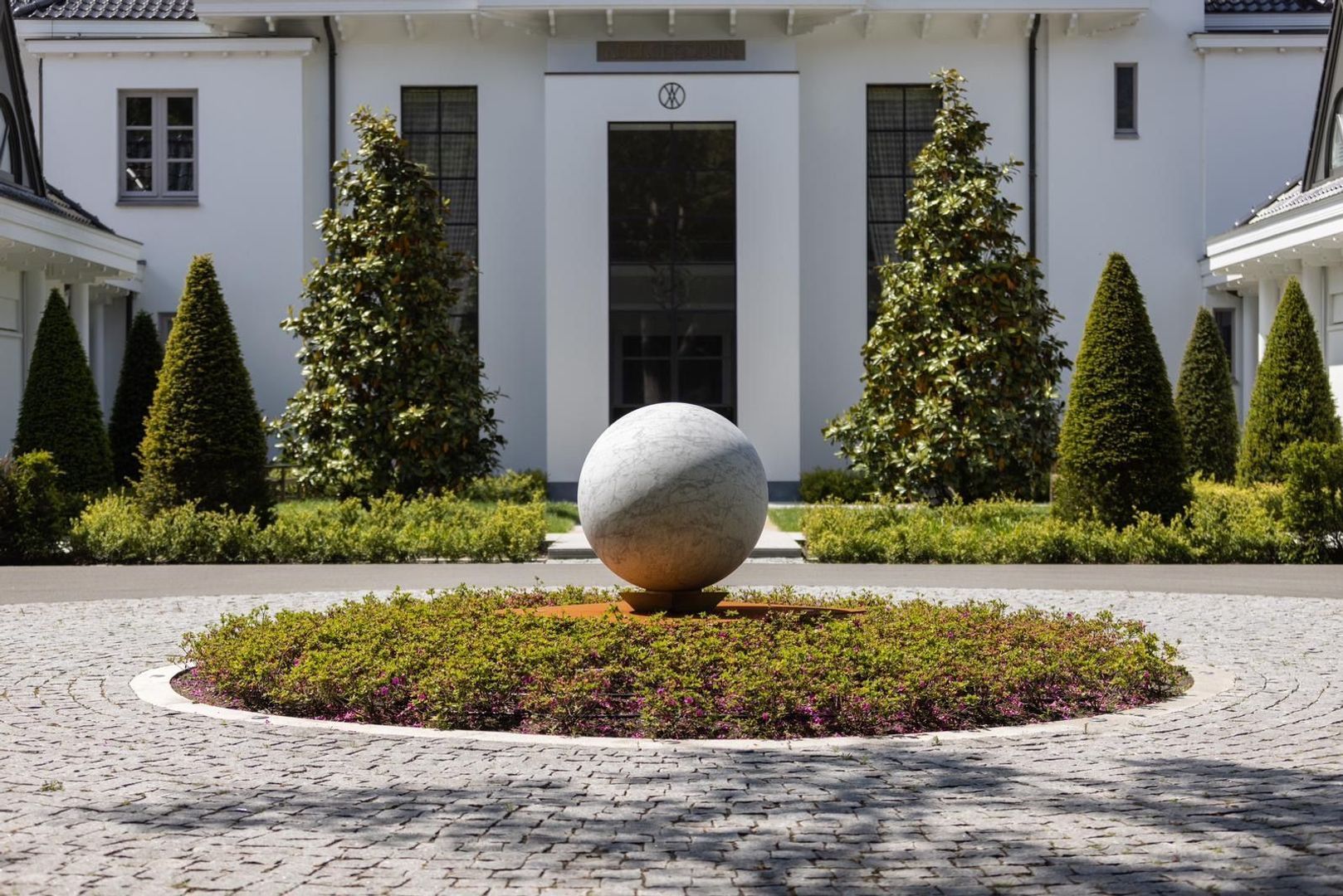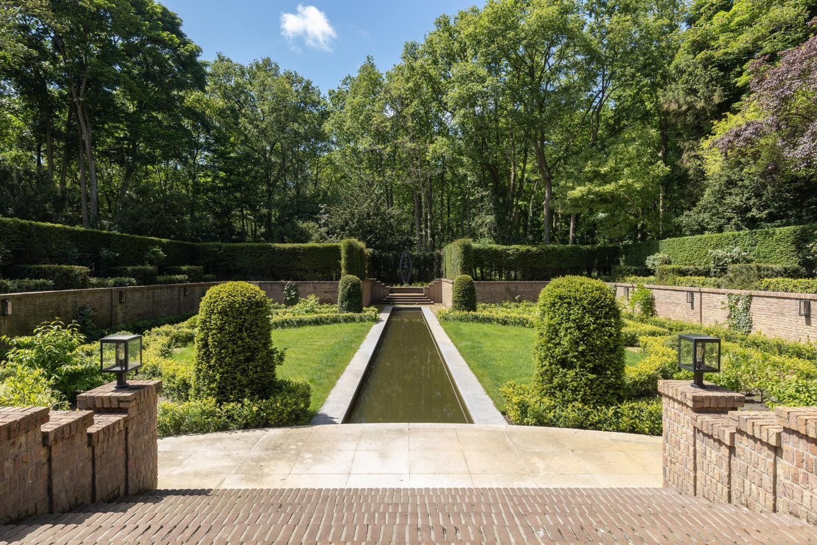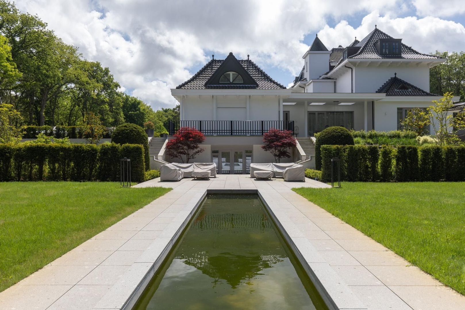 Buiten creëren aangelegde tuinen, terrassen en vijvers een serene omgeving. Een aparte garage van 550 m² biedt plaats aan maximaal 15 auto's en omvat gastenverblijven.