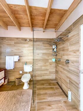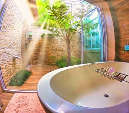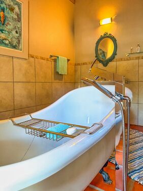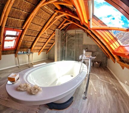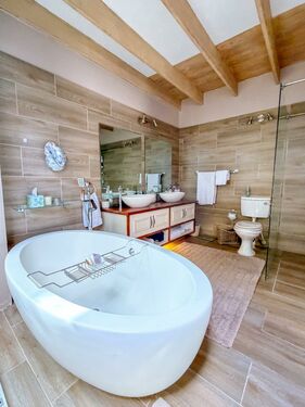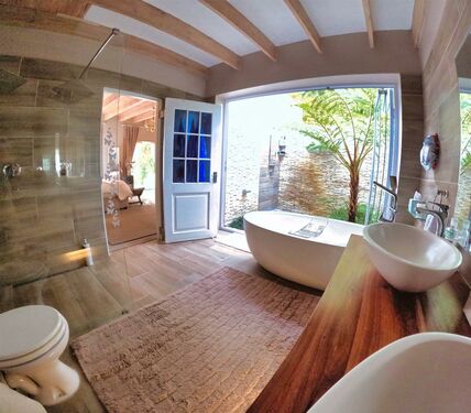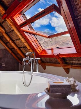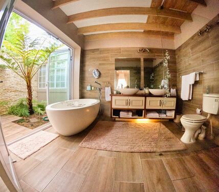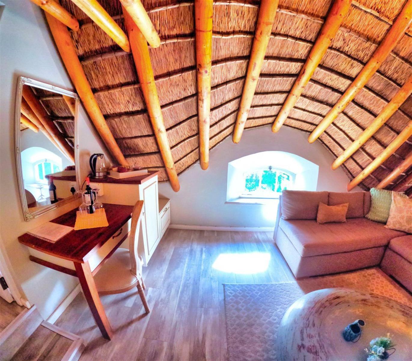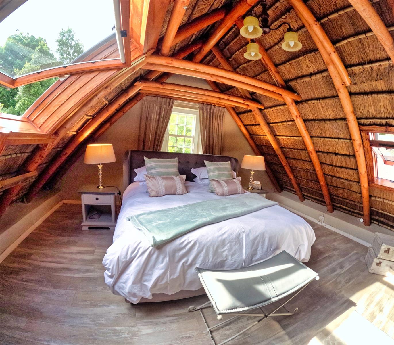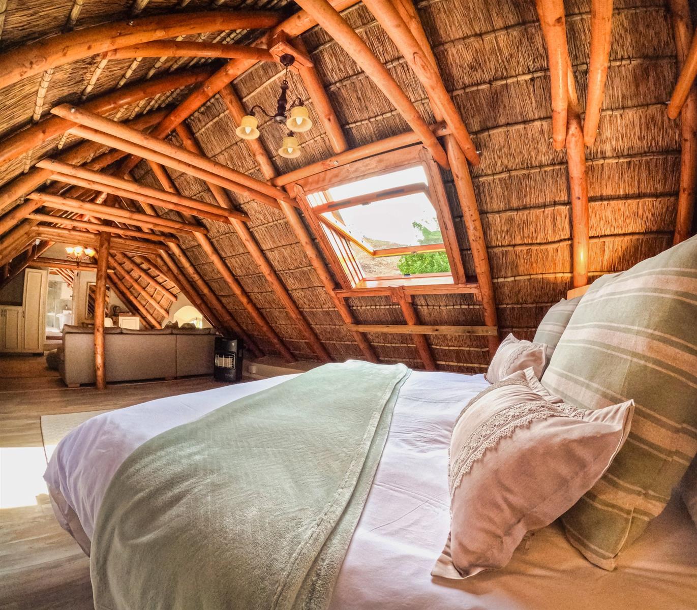 Upstairs, the loft level is crowned by a romantic “Honeymoon Suite,” bathed in natural light and framed by expansive windows that open onto majestic views across the nature reserve and surrounding mountains, creating the sensation of boutique-style living immersed in nature. With its own private lounge and full en-suite bathroom, this elevated space feels both peaceful and indulgent. Together, these spaces offer generous accommodation for family, guests, or creative retreats.