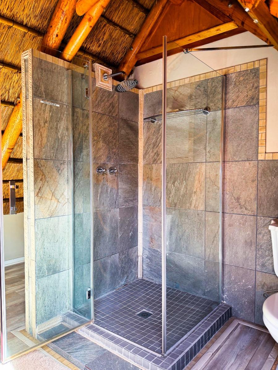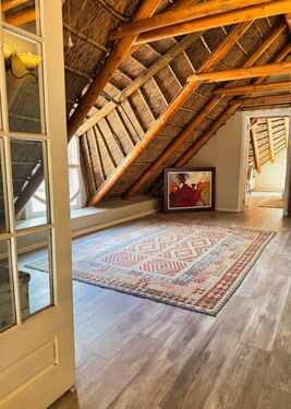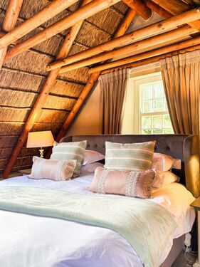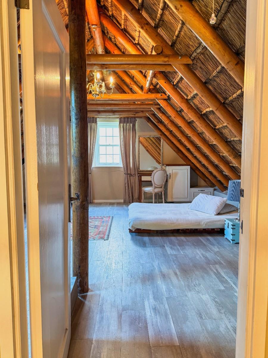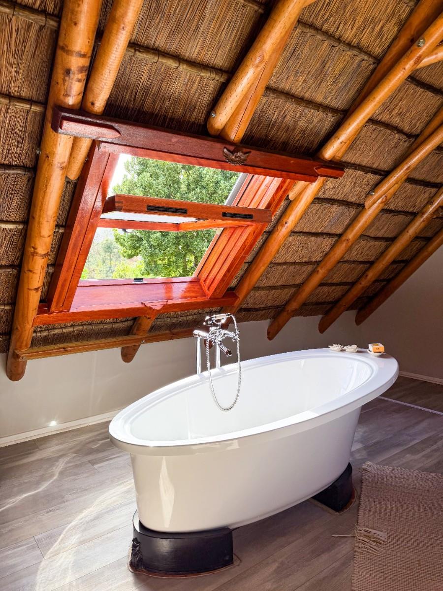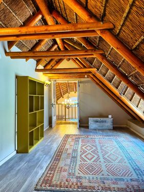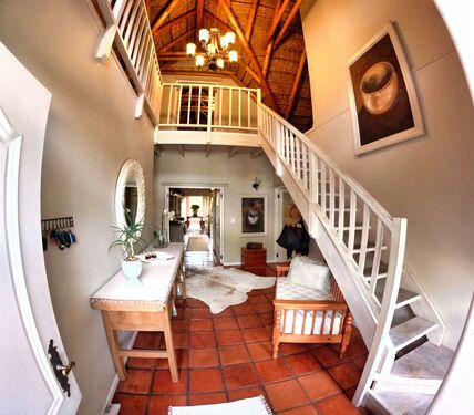 Positioned on an expansive 3,057 m² erf, this elegant “H”-plan home spans approximately 722 m² over two levels, seamlessly blending classic architectural charm with modern, off-grid comfort. The thick thatch roofing, high ceilings, and generous proportions create a sense of warmth, calm, and timeless sophistication throughout.