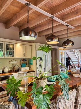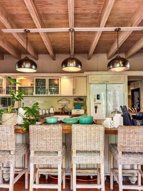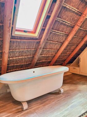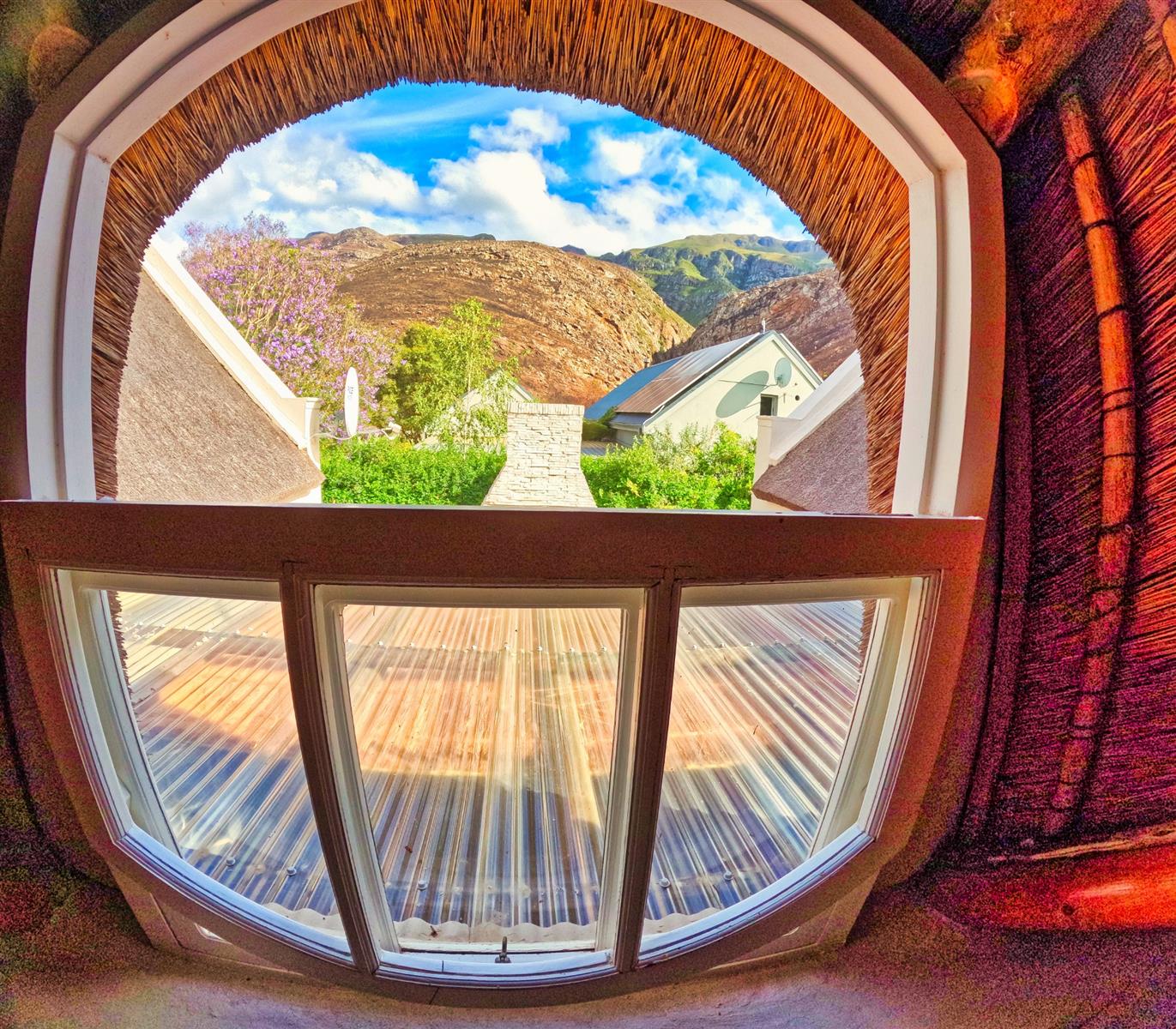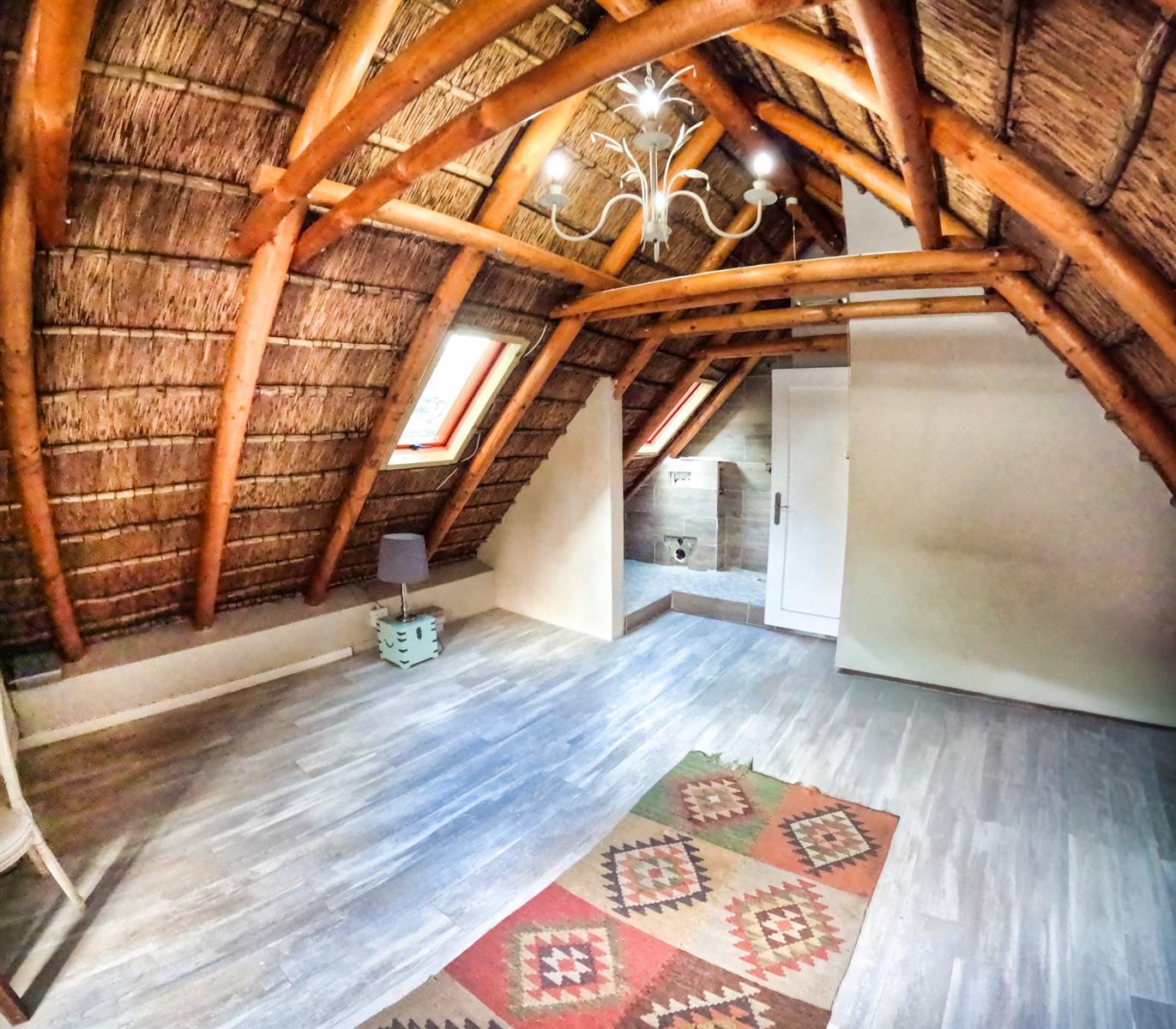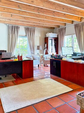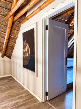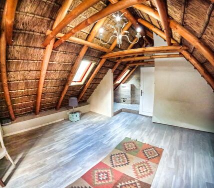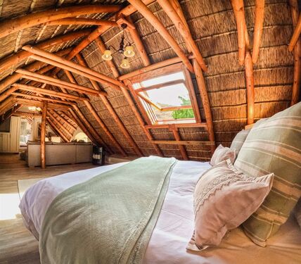 Positioned on an expansive 3,057 m² erf, this elegant “H”-plan home spans approximately 722 m² over two levels, seamlessly blending classic architectural charm with modern, off-grid comfort. The thick thatch roofing, high ceilings, and generous proportions create a sense of warmth, calm, and timeless sophistication throughout.