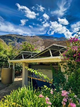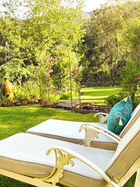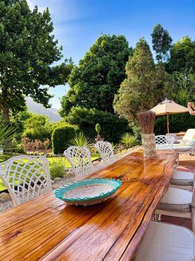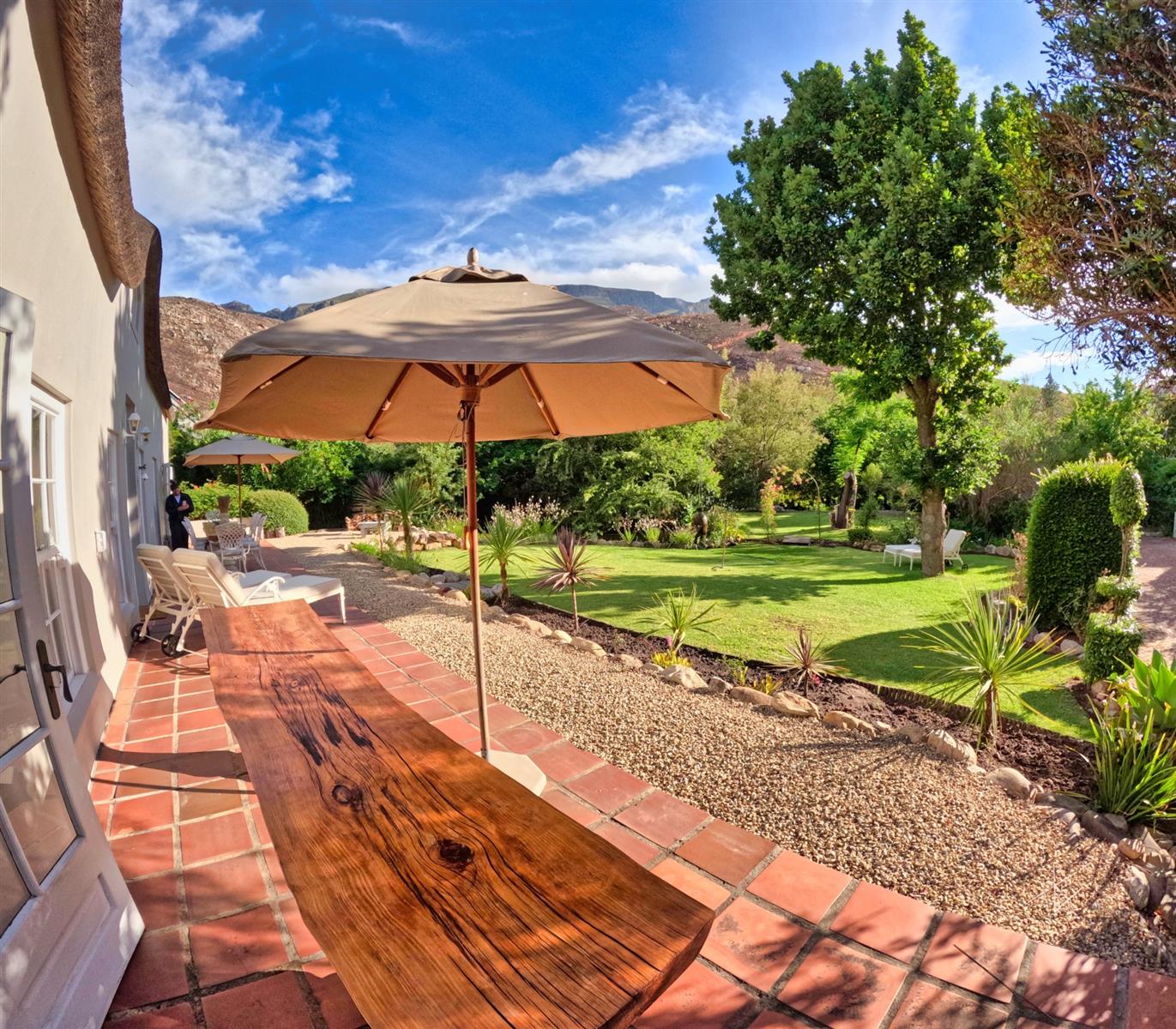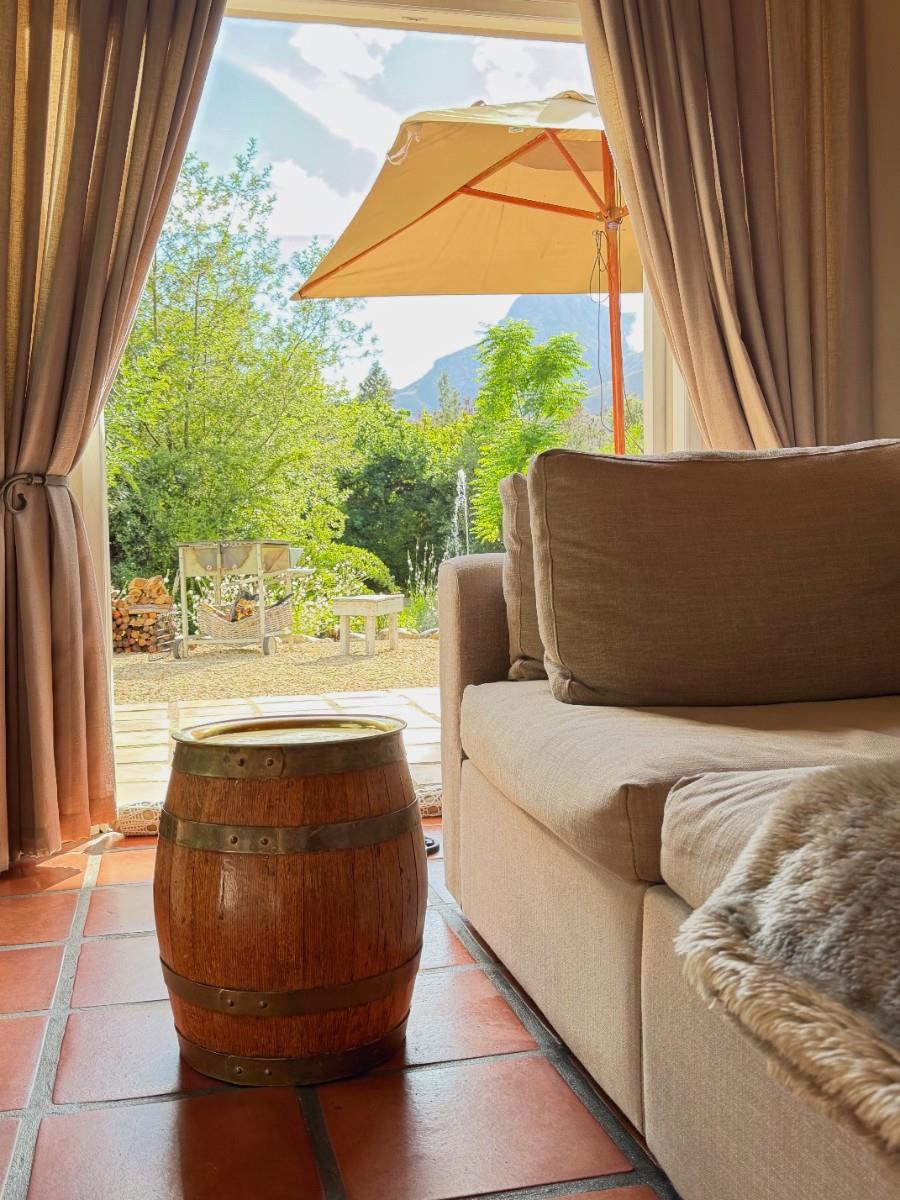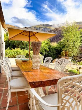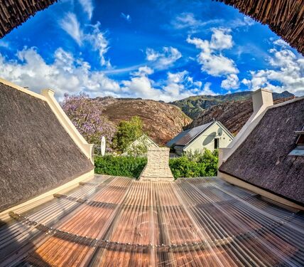 Nature is woven into every aspect of Tortoise Brook. The perennial Noupoort River flows gently through the property, while mature oak trees provide dappled shade over irrigated gardens. A natural stream invites refreshing summer swims, and north-east-facing views of the Riviersonderend Mountains deliver unforgettable sunrises and golden-hour sunsets. Direct access to mountain trails, including the renowned Boesmanskloof Trail, makes this an ideal haven for hikers, cyclists, and outdoor lovers.