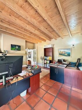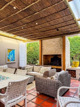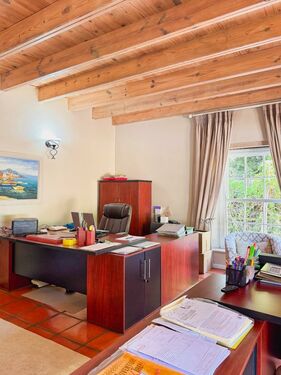 The ground floor offers two spacious en-suite bedrooms, a guest bathroom, a gracious lounge and dining areas, and a large office that could easily serve as a second lounge or sixth bedroom. At the heart of the home is a welcoming covered courtyard and braai room with fireplace, perfect for relaxed entertaining in all seasons. A well-equipped kitchen, scullery, and laundry complete this level.