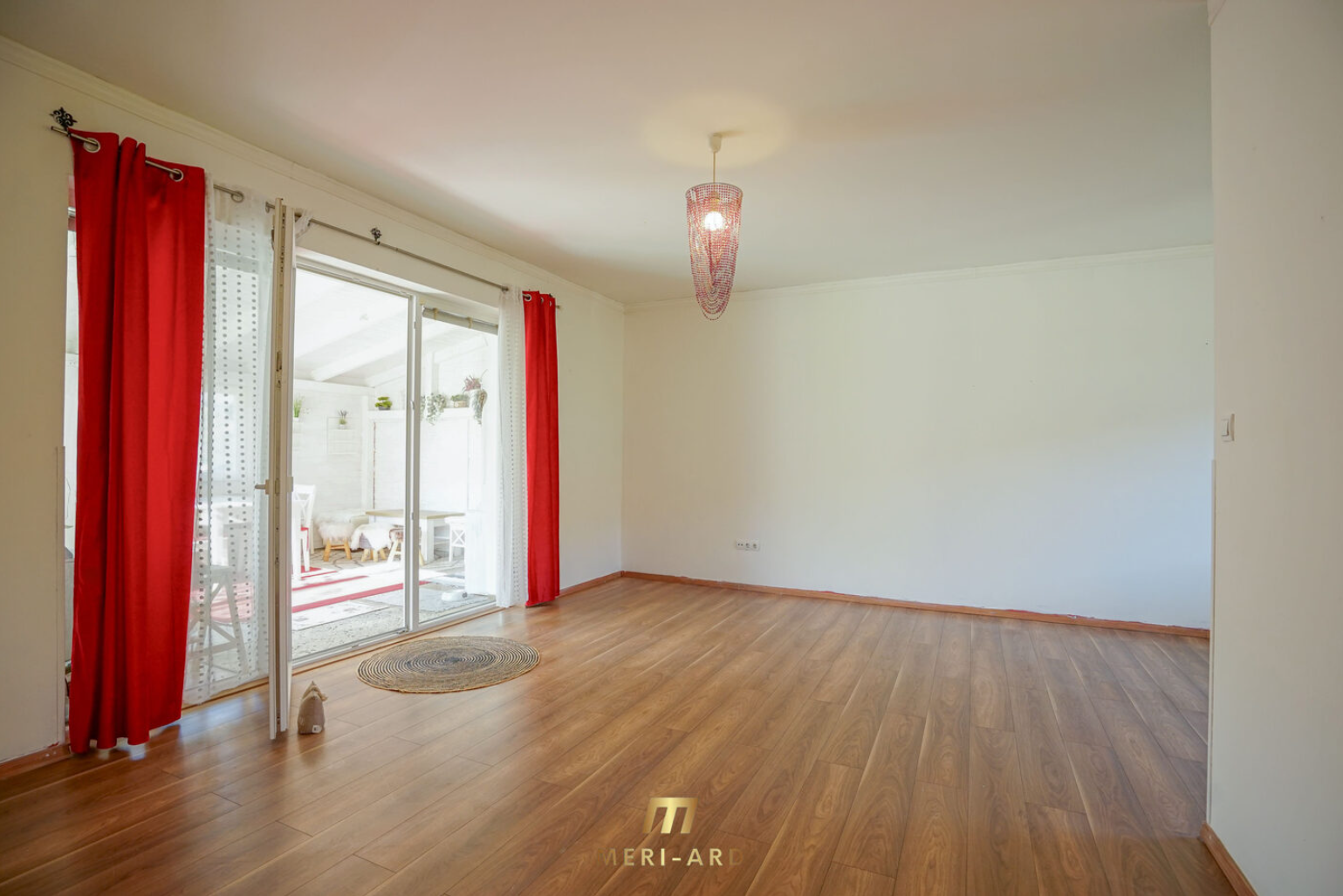 Directly ahead is an open living room connected to a modern kitchen and dining area. From the living room, there is direct access to the terrace and a landscaped garden with a swimming pool – perfect for relaxation or summer barbecues.