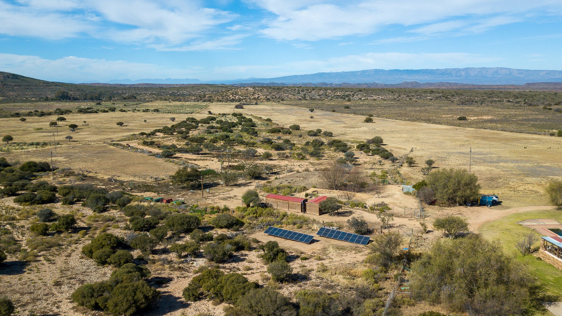 Buildings on the farm include a Karoo-Style farmhouse with five bedrooms, two bathrooms; living room, study, TV room and kitchen, all spacious and comfortable. The large undercover veranda is inviting and cool, entertainment made easy. Outbuildings consisting of 1x large barn for storage of Lucerne bales, 1 x workshop with a very large vehicle port attached for tractors and implements, 2 x (Wendy Houses) as labourers’ cottages. Not to mention slaughtering facilities and even a chicken coop. Good road network on the farm.