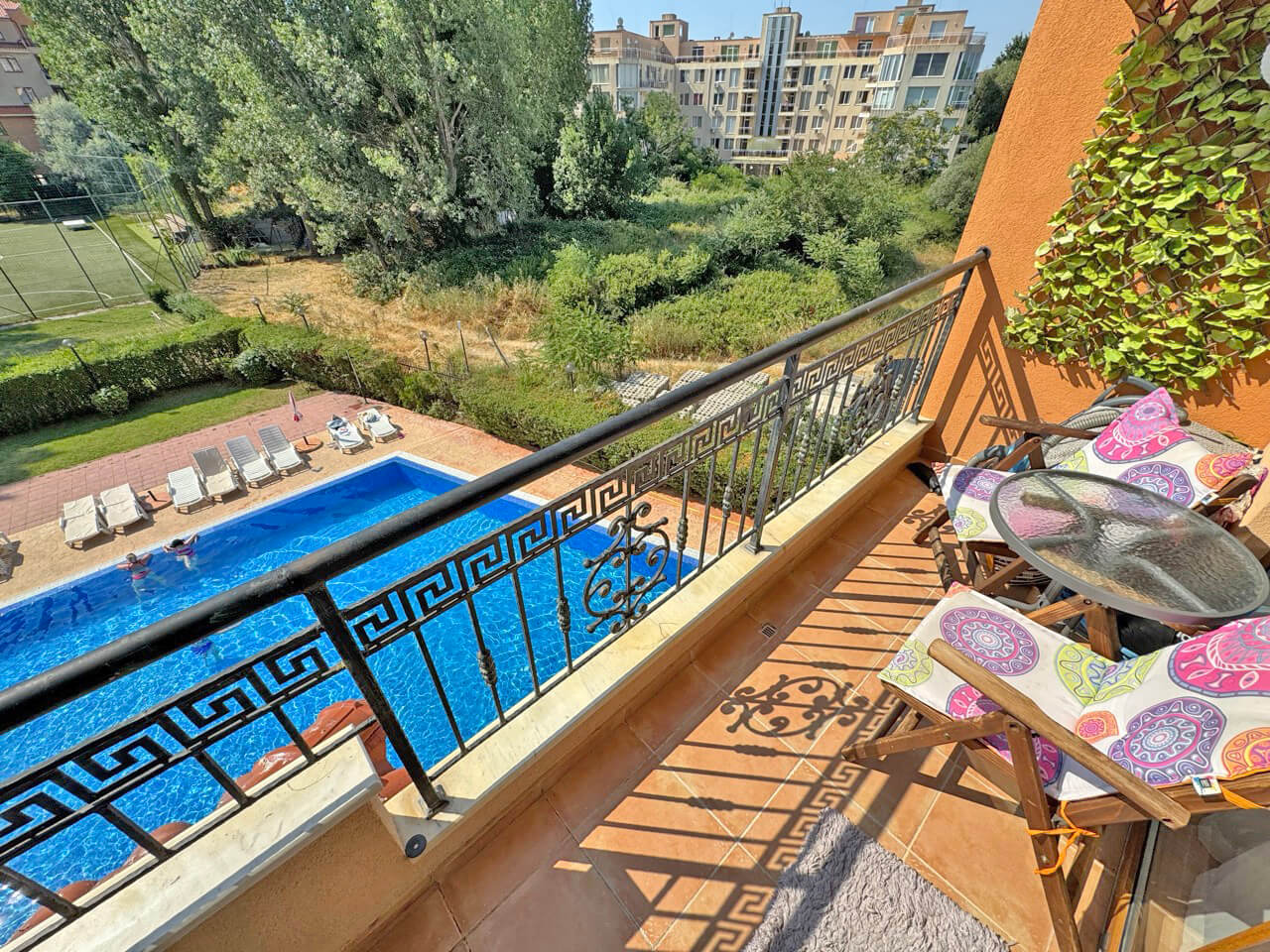 Balcony with a pool view