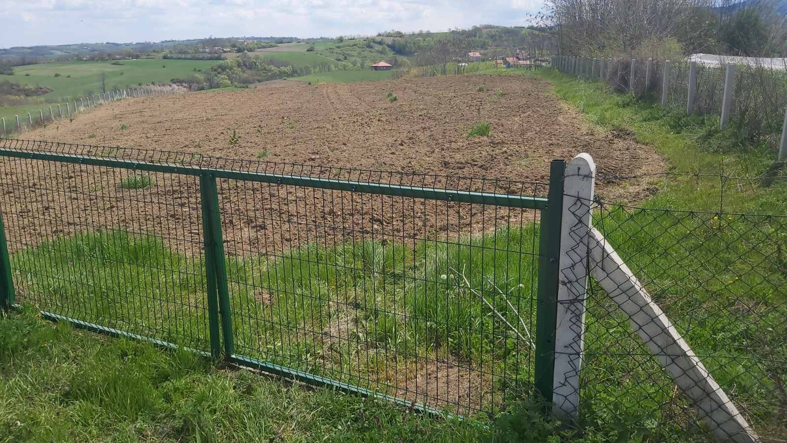 The entire lot is fenced with 5x5 cm high braided wire, 120 cm high, with barbed wire at the bottom and top of the fence to protect it from animals, and there are concrete pillars 2 m apart everywhere.