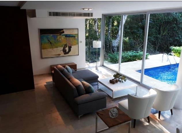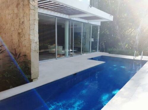 Surrounded and naturally adorned by the beautiful Mayan jungle with its tall trees. It has four rooms with private bathroom and two of them with dressing room, double height room, living room, dining room, kitchen, laundry room, pool and splash pool.