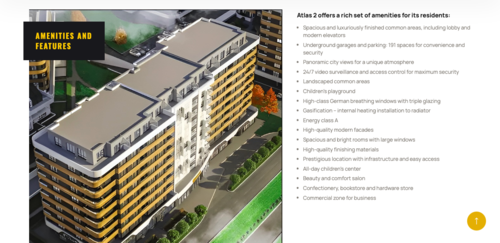 The properties are delivered in “shell and core” condition: with wiring prepared for air conditioners in every room, connections for gas radiators, installed entrance door, finished terrace, and fully completed common areas of the building. All buildings are gasified.