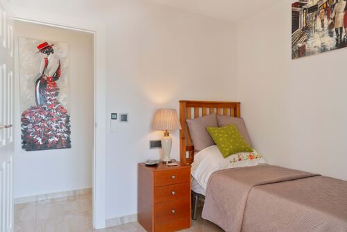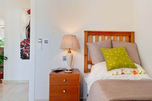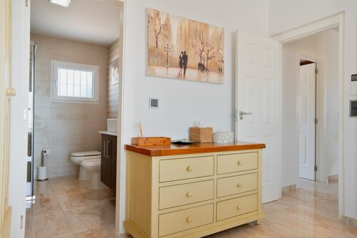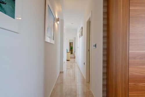 Adjacent to the lounge, there is a single bedroom with a private terrace, providing your guests a space for relaxation. and a master bedroom with an en-suite and access to a separate terrace, Continuing past the kitchen, you will find a bathroom, followed by two additional double bedrooms that share a terrace exclusively for family or guests.