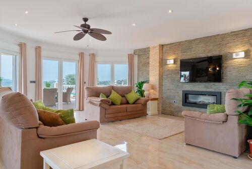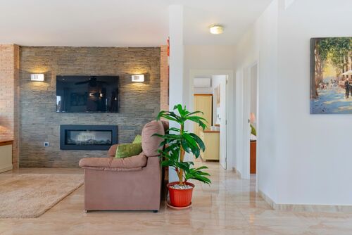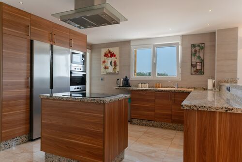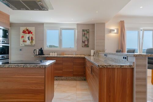 As you enter the home, you are greeted by a welcoming hallway that leads to an open-plan sitting room with large double-glazed windows and doors that tilt and open. The property's unique style features striking brick pillars, tasteful wall lighting, and an electric fireplace, and A/C throughout creating an inviting ambiance. The lounge offers unobstructed, views of the lake. The open-plan design connects the lounge, dining room, and kitchen, making it ideal for hosting and entertaining guests. The kitchen boasts high-quality cabinetry, marble-effect worktops, built-in ovens, and an electric hob on the central island. Again, the kitchen offers panoramic views and an additional door leading to the expansive terrace overlooking the 12x6 pool. A convenient laundry room is also available.